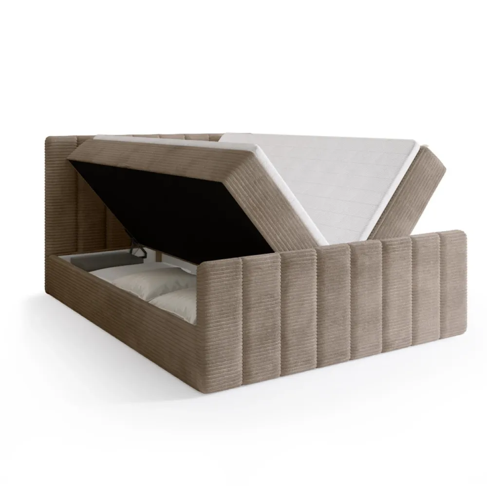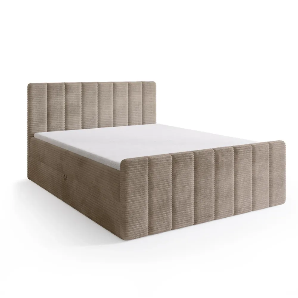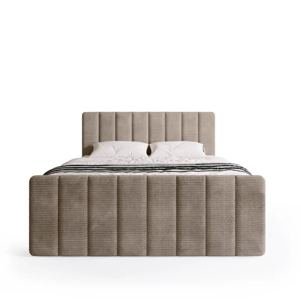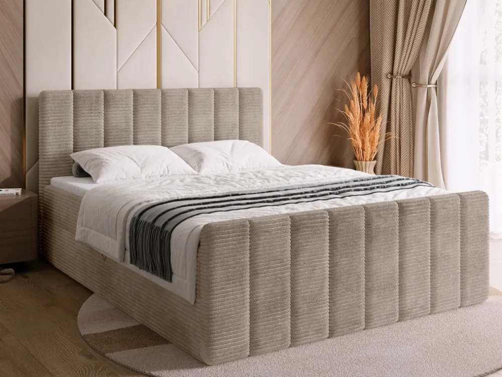 Łóżko wykonane jest w tkaninie POSO – szerokim, miękkim sztruksie o wyrazistej, prążkowanej strukturze. Materiał ten wyróżnia się wyjątkową przytulnością i aksamitnym wykończeniem, które zapewnia przyjemne doznania podczas codziennego użytkowania. Delikatne, grube prążki nie tylko dodają meblowi charakteru, ale również subtelnie zmieniają wygląd w zależności od kąta padania światła. Tkanina POSO łączy estetykę z trwałością – jest odporna na ścieranie i blaknięcie kolorów, dzięki czemu łóżko zachowuje swój elegancki wygląd na długi czas.