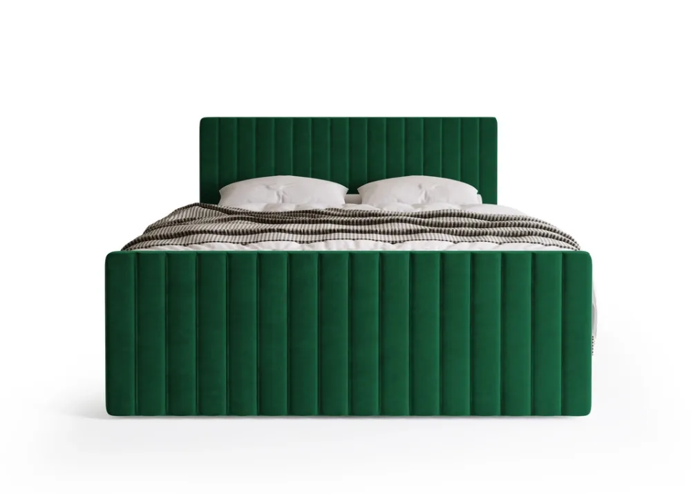 - Zielone łóżko kontynentalne DREAM DUO 140×200 cm obite welurową tkaniną Kronos 19. Wyposażone w materac ze sprężynami bonell, dwoma pojemnikami i tapicerowanym zagłówkiem. Komfortowy sen i elegancja w Twojej sypialni – idealne do nowoczesnych wnętrz.