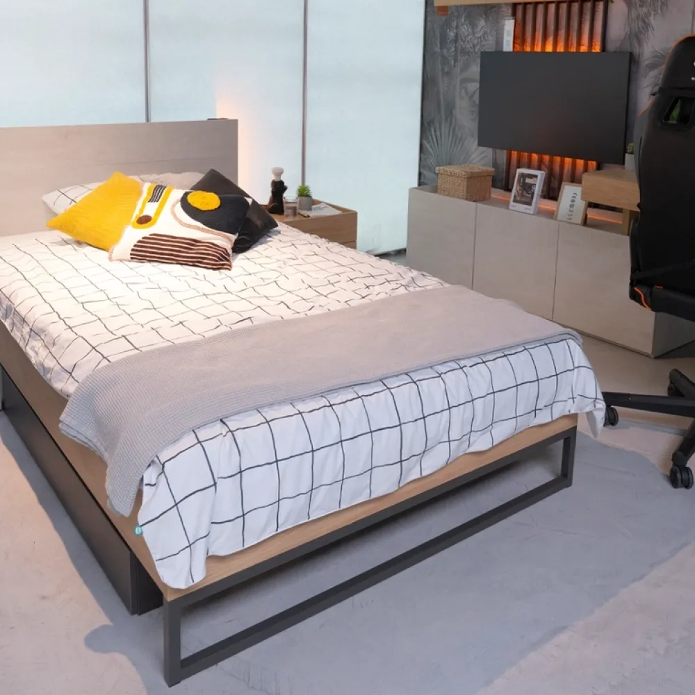 - Łóżko zostało wyposażone w drewniany stelaż jednak nie posiada materaca. Odpowiedni materac znajduje się poniżej, w sekcji „POELCANE”.