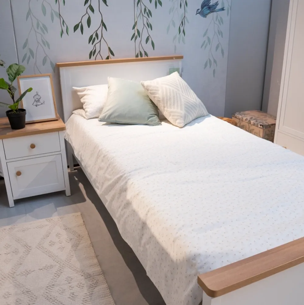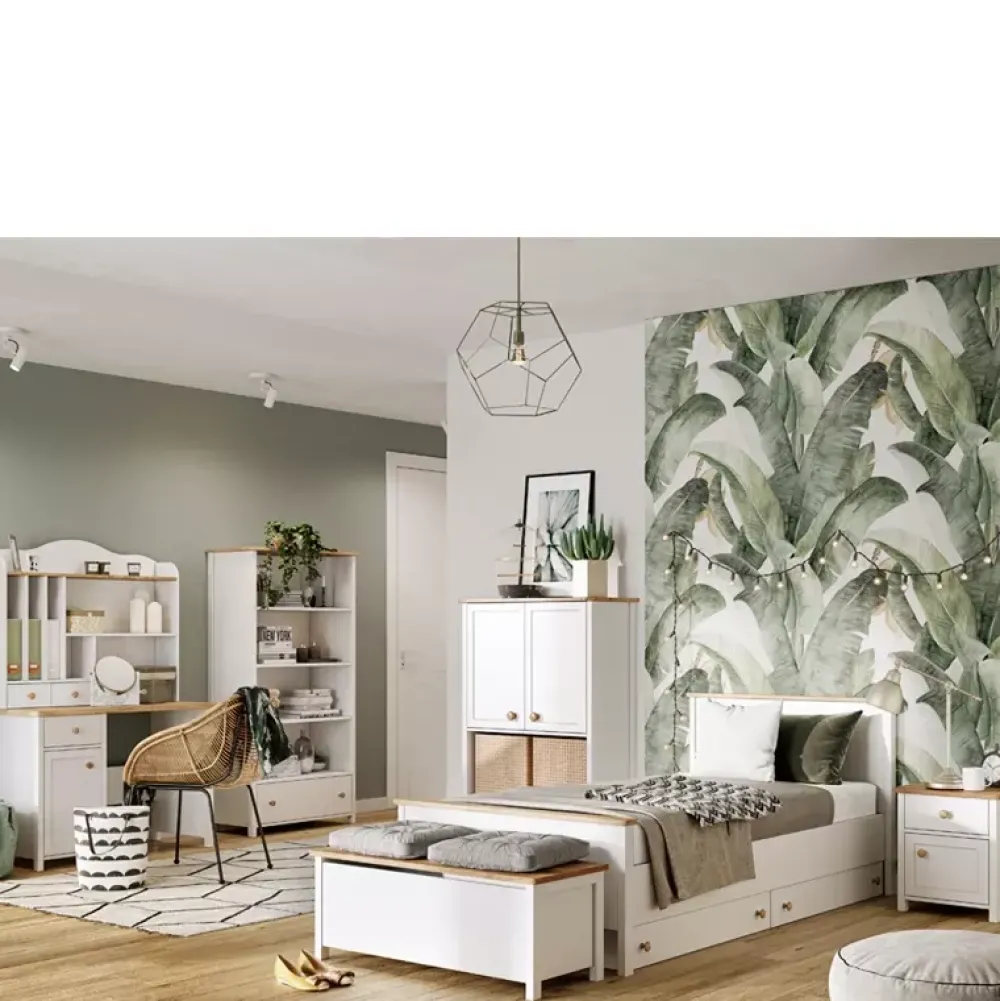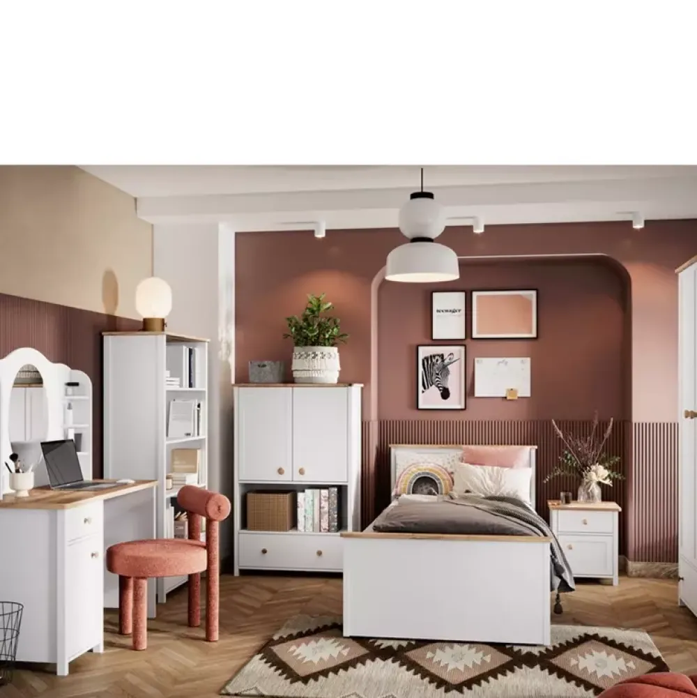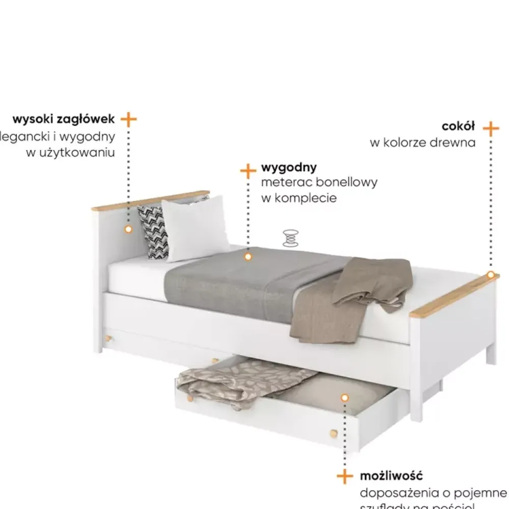 Łóżko ze stelażem i materacem do pokoju młodzieżowego STORY zostało wykonane w kolorze bieli alpejskiej z akcentami dębu nash. Łóżko młodzieżowe zostało wyposażone w drewniany stelaż oraz materac ze sprężynami typu bonell, który pozwala zachować komfort snu oraz zdrowie kręgosłupa.