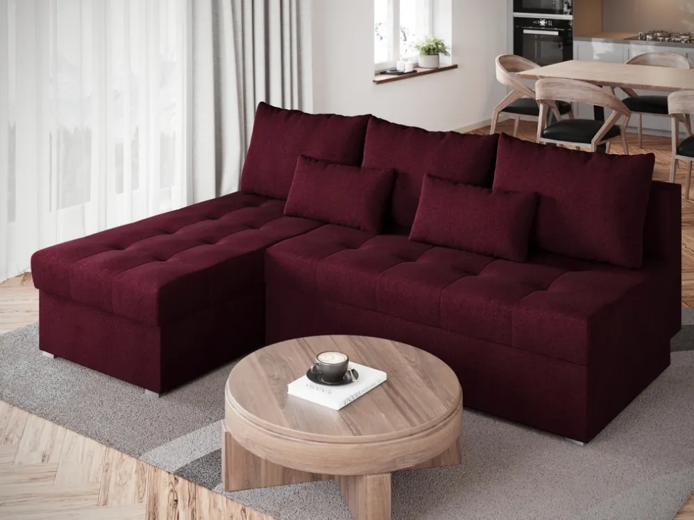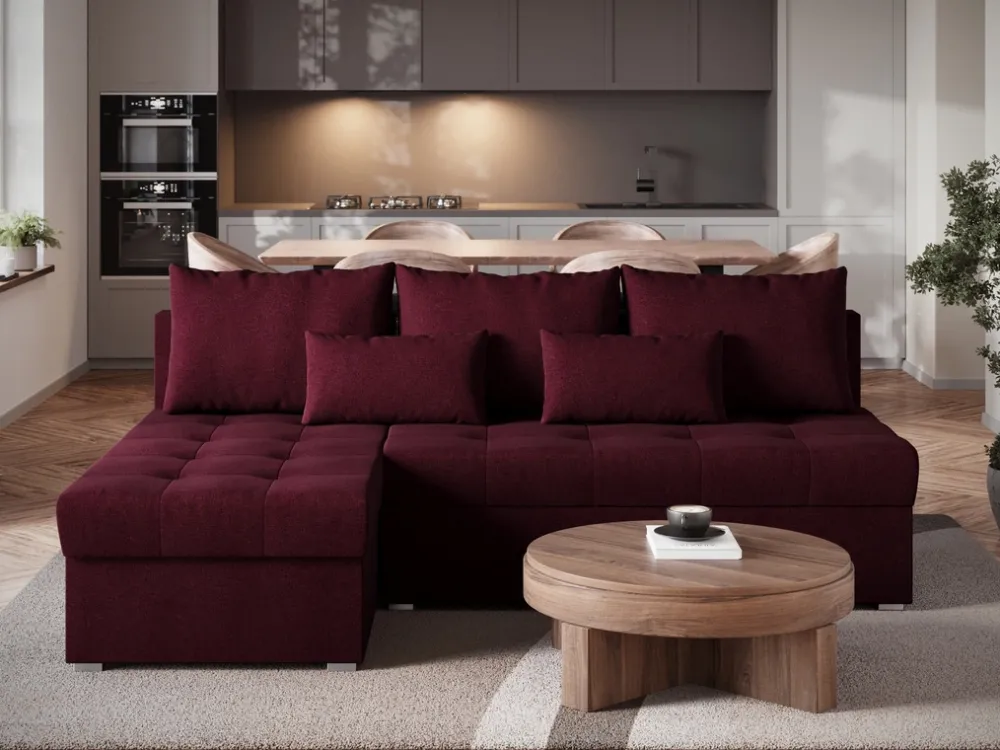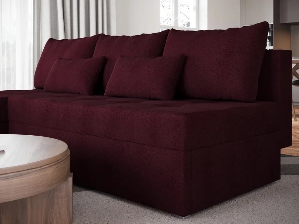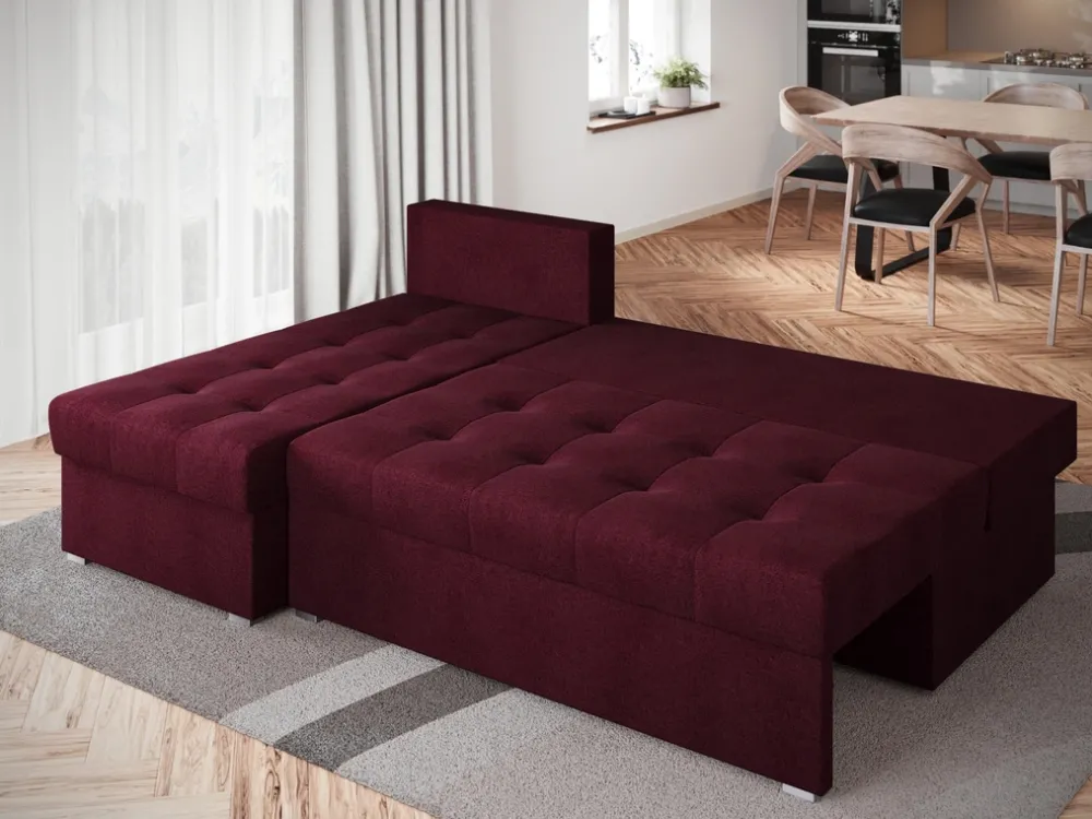 Narożnik wyposażony jest w funkcję spania, co sprawia, że w kilka chwil można zamienić go w łóżko o powierzchni 120×200 cm. To praktyczne rozwiązanie, które idealnie sprawdzi się podczas wizyt gości, a także pozwoli zaoszczędzić miejsce w salonie. Pod siedziskiem znajduje się pojemny schowek na pościel, który umożliwia wygodne przechowywanie koców, poduszek czy dodatkowej pościeli – wszystko w zasięgu ręki.