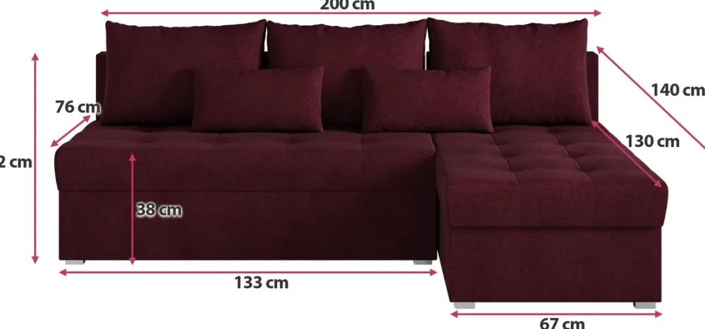 - Narożnik posiada funkcję spania o powierzchni 120×200 cm. Rozkładanie odbywa się za pomocą pociągnięcia siedziska do siebie oraz złożenia oparcia.