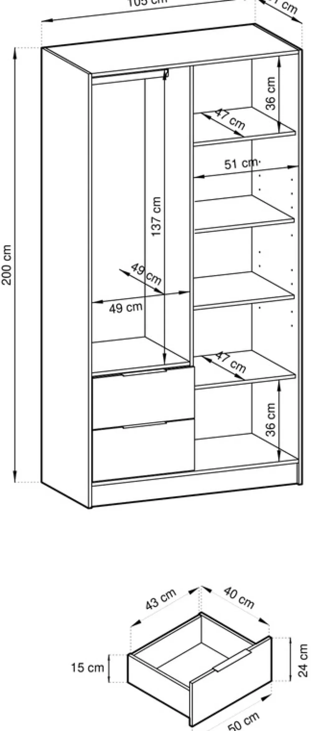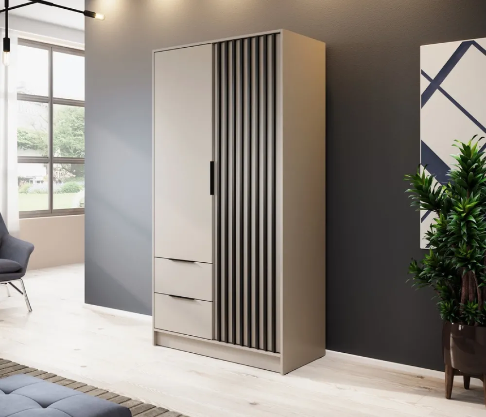 - Szafa uchylna 105 cm KELLY posiada dwie szuflady z prowadnicami kulkowymi u dołu, oraz drzwi po lewej stronie, za którymi znajduje się drążek na wieszaki i pięć półek za drzwiami z lamelami po prawej stronie. Metalowe czarne uchwyty.