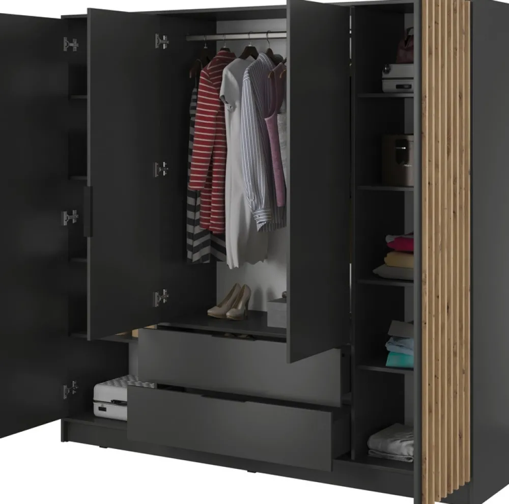 Centralna część szafy została zaprojektowana z myślą o przechowywaniu odzieży wymagającej zawieszenia, takiej jak płaszcze, marynarki czy sukienki. Dwie wygodne szuflady ułatwiają segregację drobniejszych elementów garderoby. Po bokach szafy, za ozdobnymi lamelami, czeka aż dziesięć półek, które pomogą utrzymać idealny porządek w Twojej przestrzeni.
