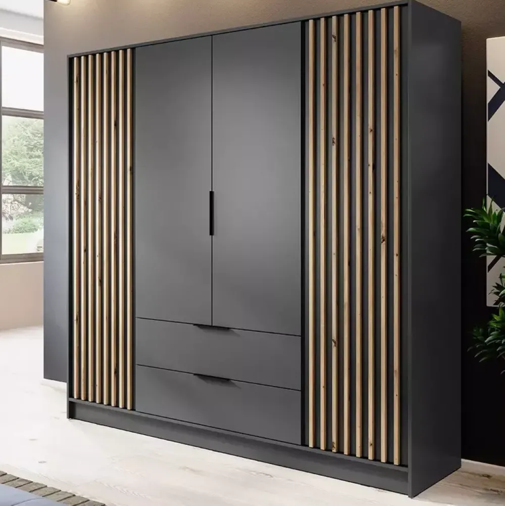 Efektowne drzwi z lamelami i czarne, metalowe uchwyty tworzą spójną, nowoczesną całość, która doskonale komponuje się z różnymi stylami wnętrz. Wykończenie obrzeży okleiną ABS zapewnia dodatkową odporność na codzienne użytkowanie, dzięki czemu szafa zachowa swój piękny wygląd przez długie lata.