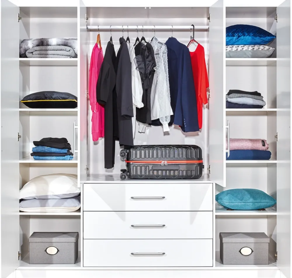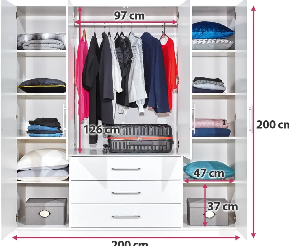 W centralnej części szafy znajduje się para drzwi, za którymi umieszczony jest drążek na wieszaki. To idealne miejsce na kurtki, płaszcze czy sukienki, które wymagają odpowiedniego przechowywania. Dzięki temu układowi wszystkie Twoje ubrania będą zawsze schludnie rozwieszone i łatwo dostępne.