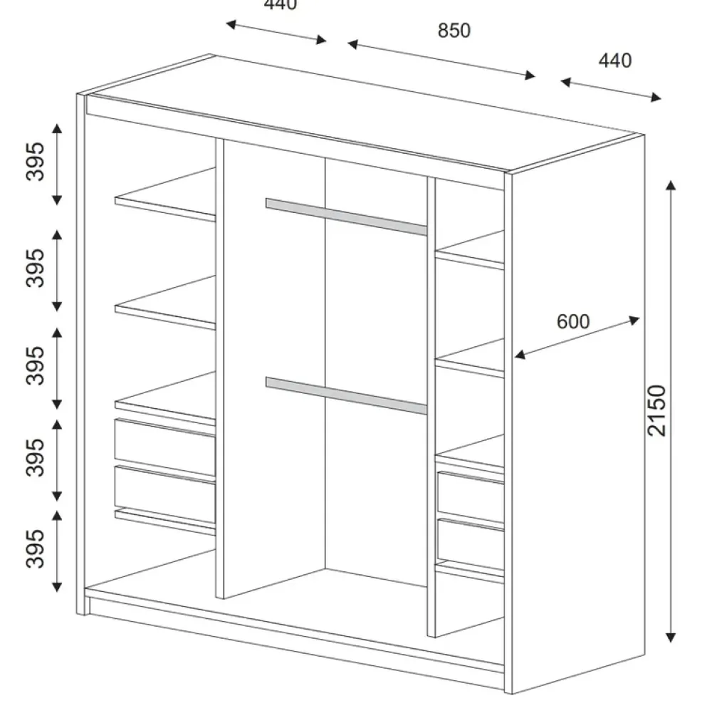 - Wymiary: szerokość 180 cm, wysokość 215 cm, głębokość 60 cm