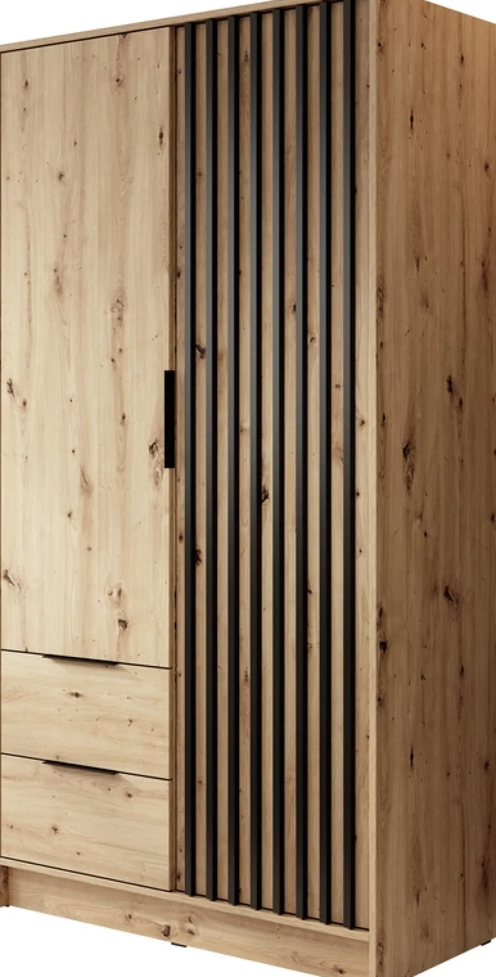 Czarne metalowe uchwyty dodają szafie nowoczesnego charakteru, a obrzeża zabezpieczone okleiną ABS gwarantują trwałość konstrukcji i odporność na codzienne użytkowanie. Estetyczne drzwi z lamelami wprowadzają do wnętrza nutę lekkości, sprawiając, że szafa stanie się nie tylko praktycznym, ale i dekoracyjnym elementem Twojego pokoju.