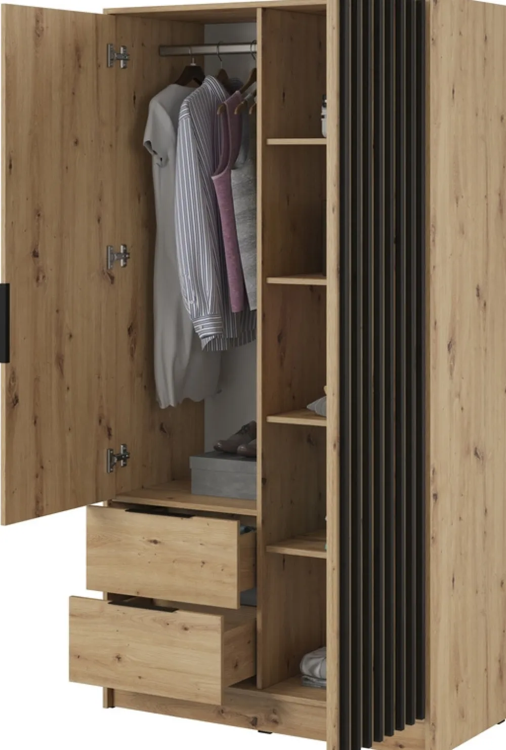 W lewej części szafy znajduje się drążek, który pozwala na wygodne wieszanie odzieży wizytowej, natomiast prawa strona kryje za eleganckimi lamelami aż pięć półek, umożliwiających posegregowanie ubrań według własnych potrzeb. Dzięki temu każda rzecz ma swoje miejsce, a Ty zyskujesz porządek i łatwy dostęp do garderoby.