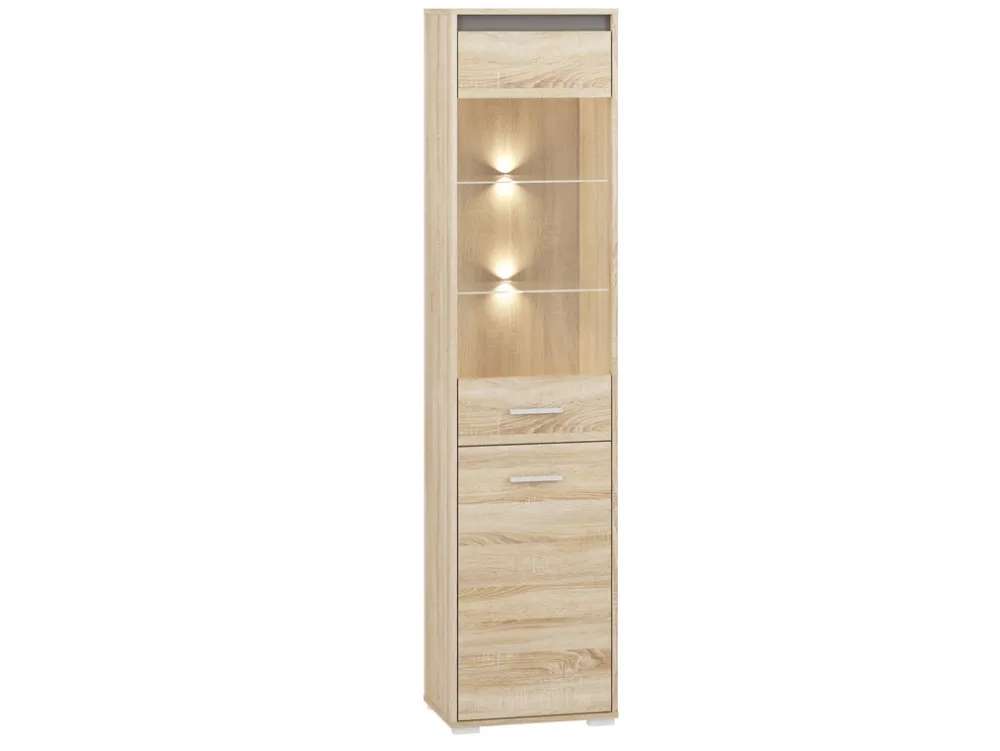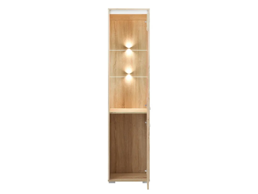 - Witryna do salonu AVO w kolorze dąb sonoma posiada trzy półki wykonane z pyty laminowanej oraz dwie szklane, które dzięki zastosowanej szybie doskonale sprawdzą się na eksponowanie porcelany. Witryna posiada obrzeża wykończone okleiną ABS.