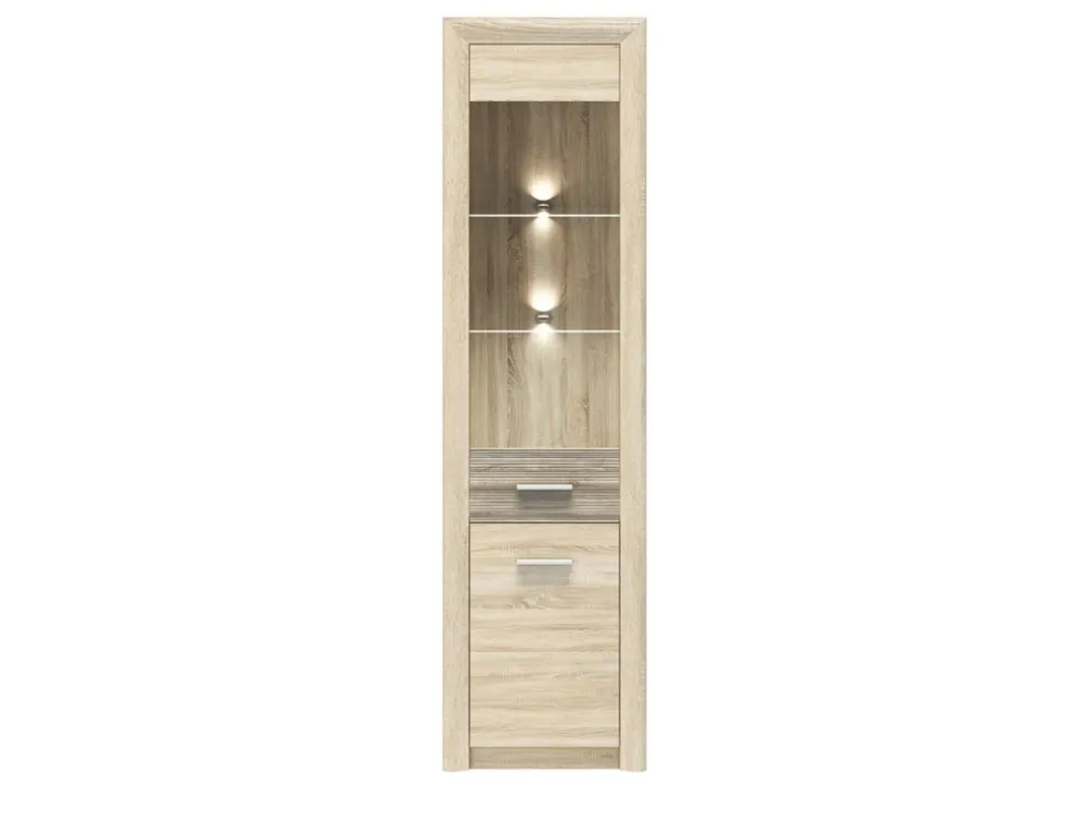 - Witryna do salonu 55 cm CASTEL posiada przeszklone drzwi, za którymi znajdują się dwie szklane półki na porcelanę i dekoracje. U dołu witryny znajdują się dwie półki. Witryna została wykonana w kolorze dąb sonoma, wstawka w kolorze truflowym.