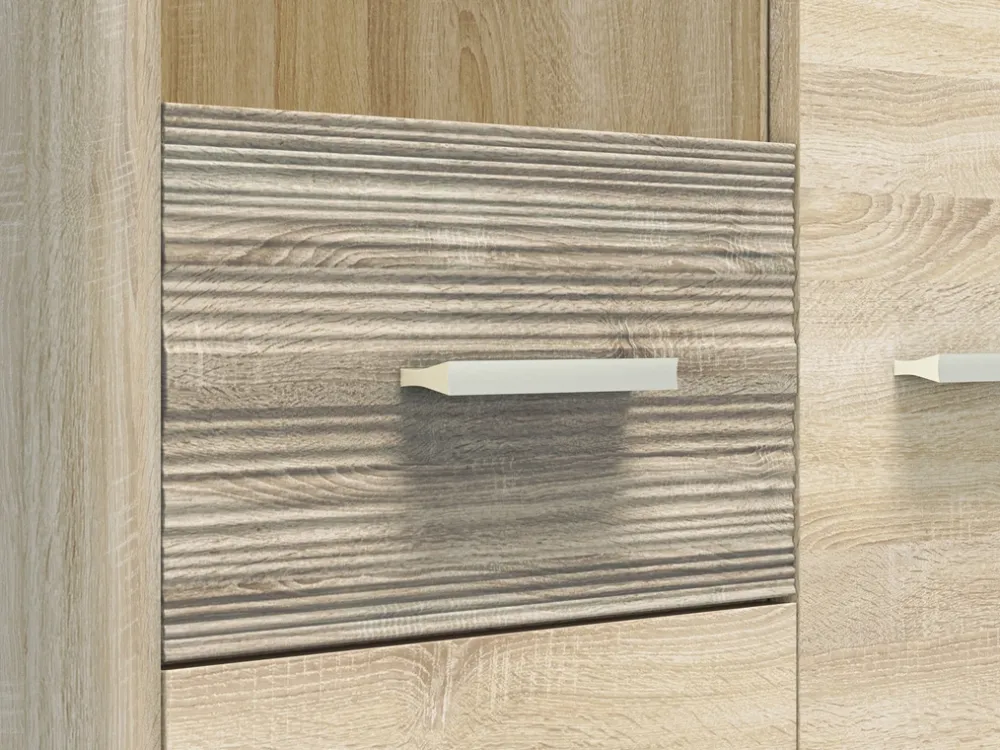 Kolor dąb sonoma to synonim naturalnego piękna i uniwersalności. Doskonale komponuje się zarówno z nowoczesnym, jak i klasycznym wystrojem wnętrz, dodając im ciepła i przytulności. Witryna została wykonana z wysokiej jakości materiałów, co gwarantuje jej trwałość i elegancki wygląd przez długie lata.