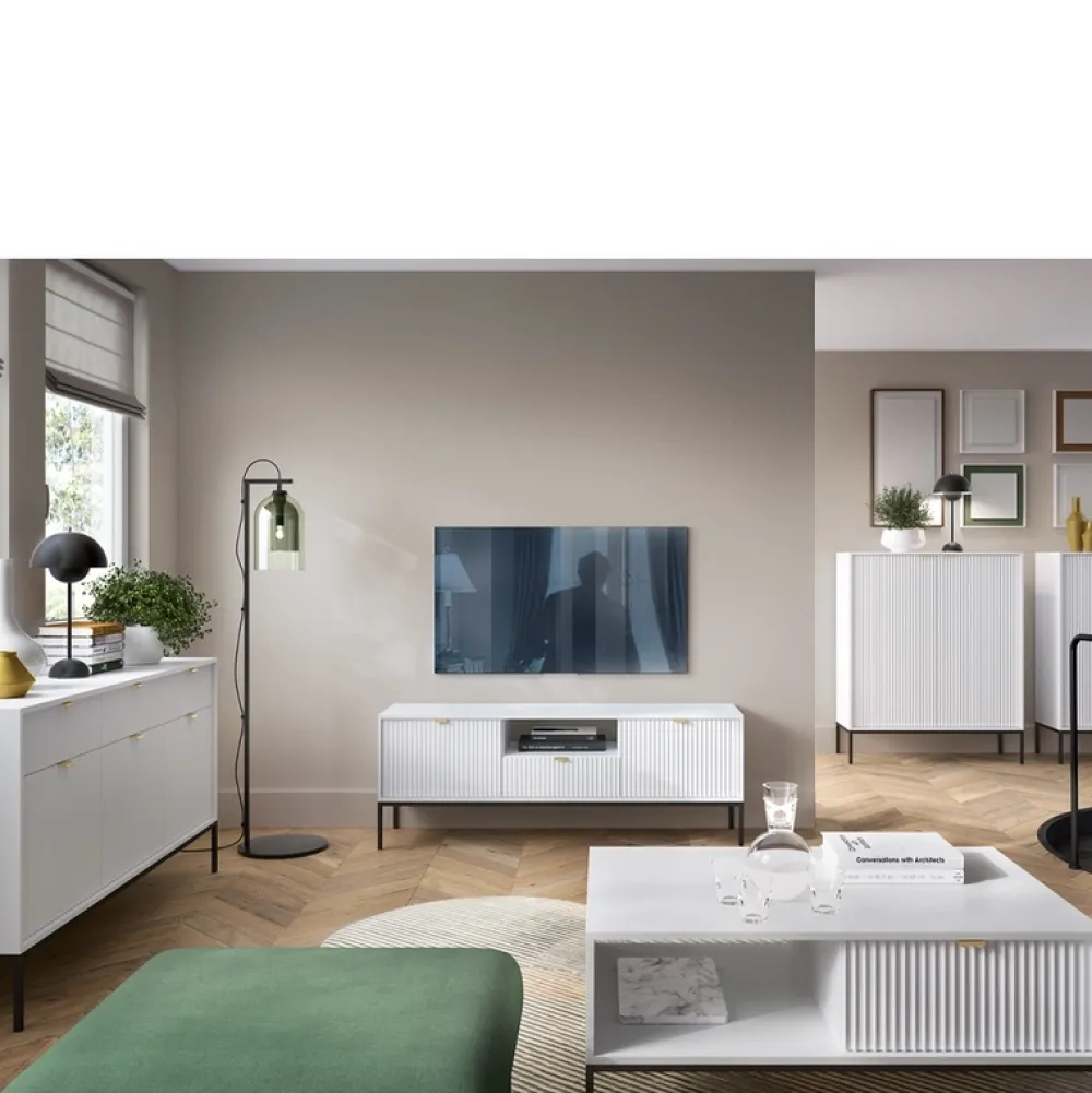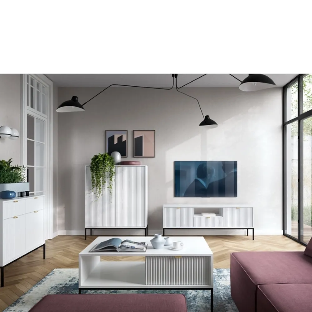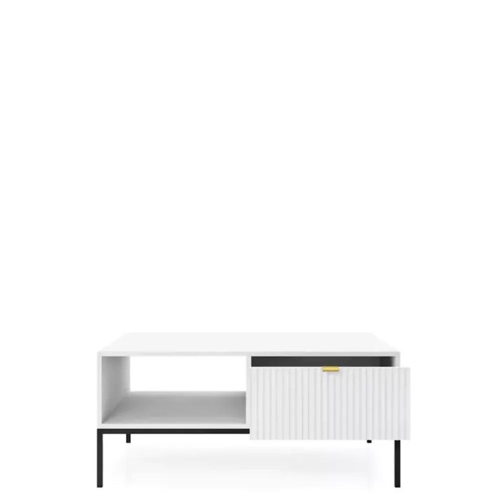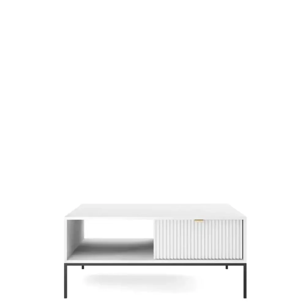 Biały stolik kawowy AVANTI idealnie odnajdzie się w towarzystwie mebli do salonu z kolekcji AVANTI. Ława ma blat w kształcie prostokąta o wymiarach 104×68, więc bez problemu postawisz na nim paterę z ciastem, gdy wpadną do Ciebie goście na popołudniową kawę. Stolik kawowy ma półkę oraz pojemną szufladę pod blatem, więc znajdziesz miejsce na odłożenie pilota lub czytaną gazetę. Biała ława z ryflowanym frontem szuflady będzie ozdobą w salonie. Postaw ją przy wygodnym narożniku i stwórz aranżację, jak z czasopisma wnętrzarskiego.