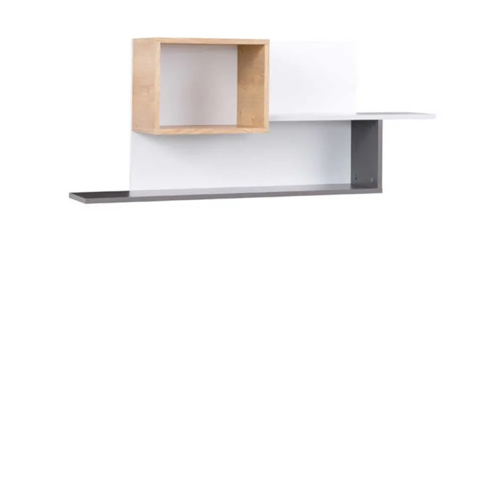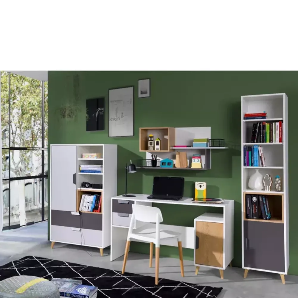- W skład zestawu wchodzą; regał z półkami i szufladami, biurko, półka wisząca oraz wąski regał z półkami.