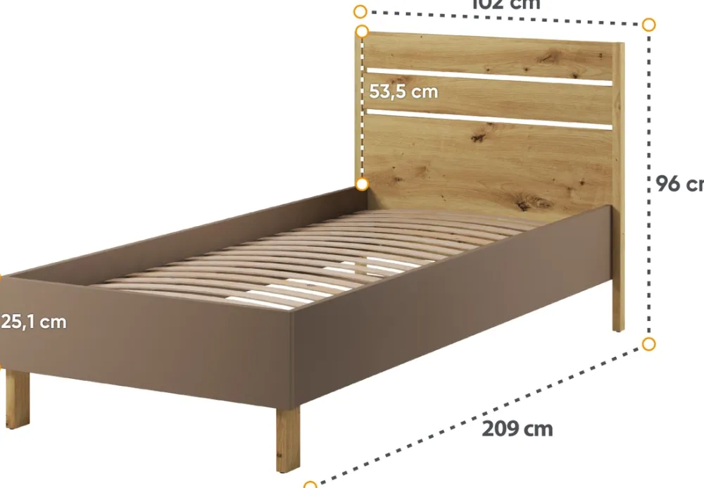 - Łóżko zostało wyposażone w stelaż listwowy lecz nie posiada materaca, odpowiedni materac znajduje się poniżej, w sekcji „POLECANE„.