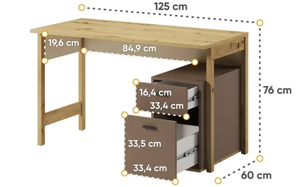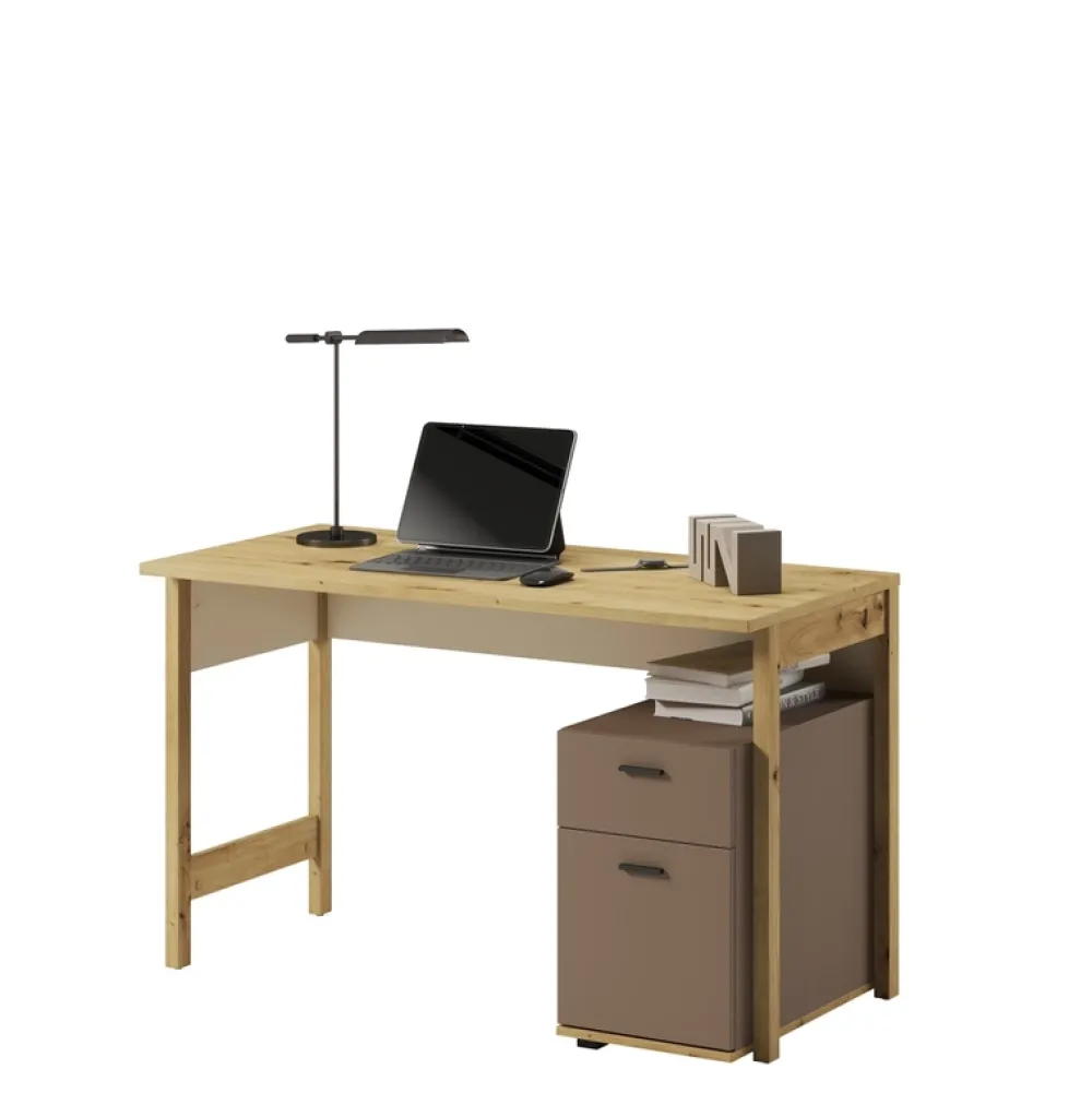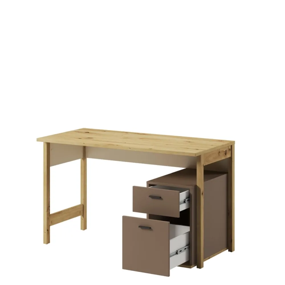 Zacznijmy od biurka. Nasze biurko z szufladami ożywia pomieszczenie swoją elegancją. Posiada dwie przestronne szuflady, zaprojektowane tak, aby pomieścić wszystko – od szkolnych podręczników po ukochane gadżety. Blat biurka jest wystarczająco przestronny, aby pomieścić laptop, lampkę i ulubione zdjęcia, zachowując przy tym porządek i organizację.
