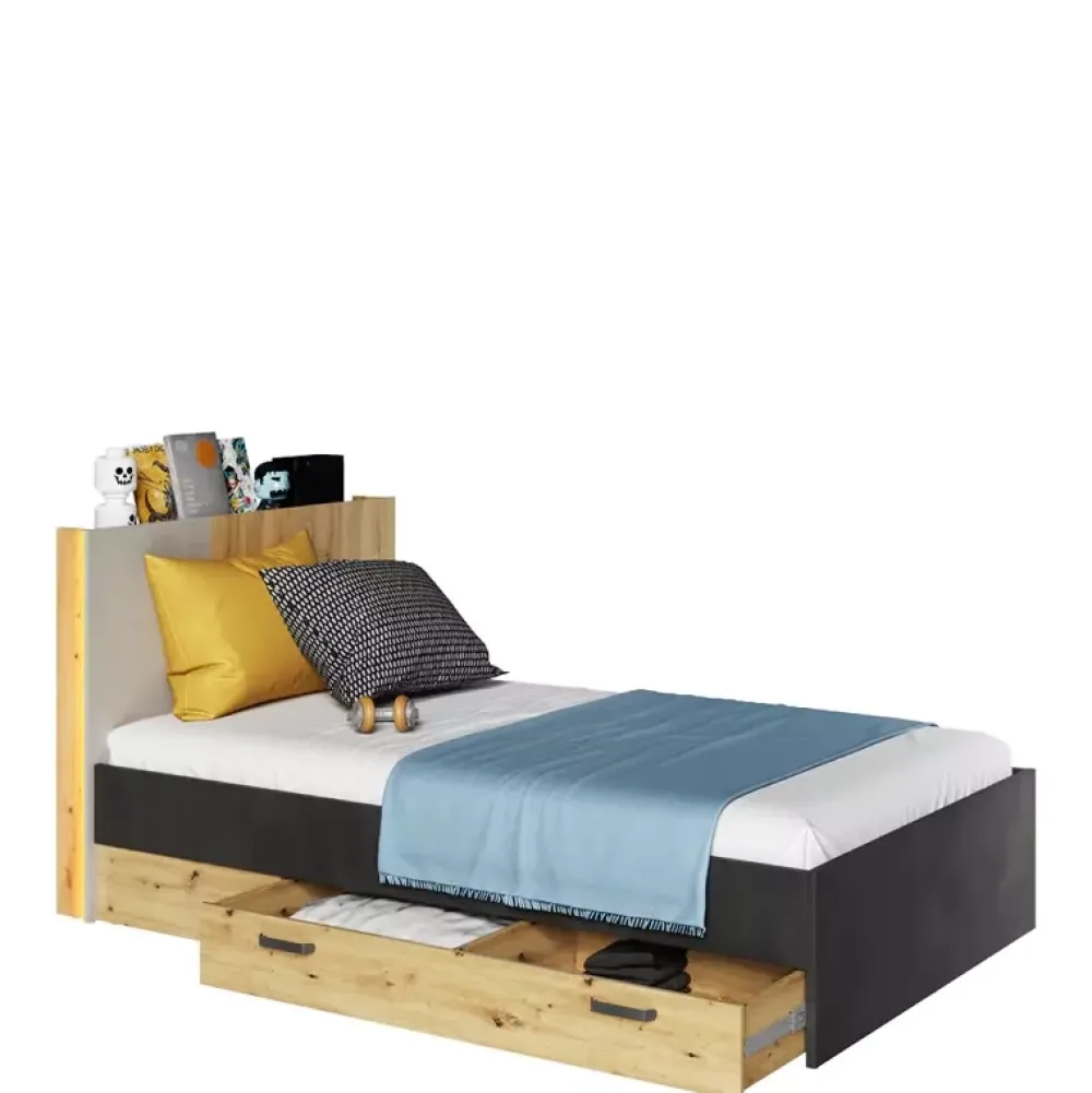 W zestawie znajduje się regał, który zagwarantuje miejsce na twoje książki oraz dekory, które pozwalają nadać pomieszczeniu niepowtarzalnych akcentów stylistycznych. W zestawie znajduje się również łóżko o powierzchni spania 120×200 cm, wyposażone w szuflady, które pełnią funkcję pojemnika na pościel.