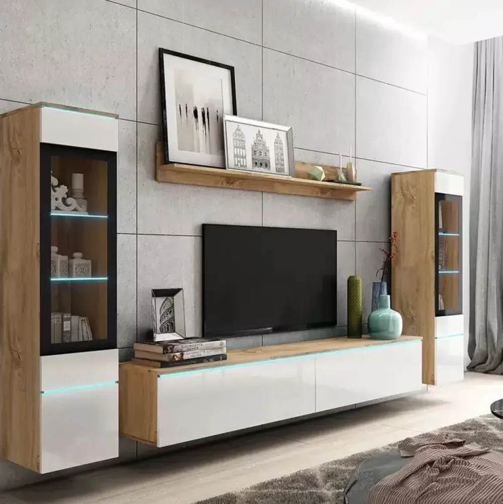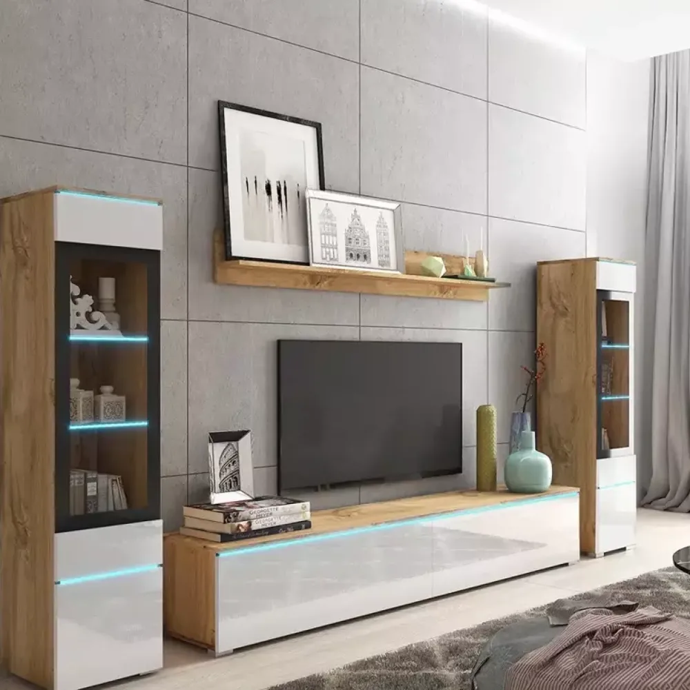 Meblościanka pokojowa VELLORE XL to idealne rozwiązanie do nowoczesnego salonu. Witryny mają przeszklone drzwi, za którymi kryją się dwie szklane półki z możliwością podświetlenia oświetleniem led, poniżej jedna półka z płyty laminowanej, a w dolnej części z oddzielnym frontem znajdują się wnęki. Duża szafka pod telewizor ma 180 cm szerokości i podzielono ją wewnątrz na dwie oddzielne części. Zarówno te szklane witryny jak i szafka rtv mogą być wiszące lub stojące. W meblościance znajduje się także wisząca półka o szerokości 140 cm, która stworzy miejsce to ekspozycji zdjęć i rodzinnych pamiątek.