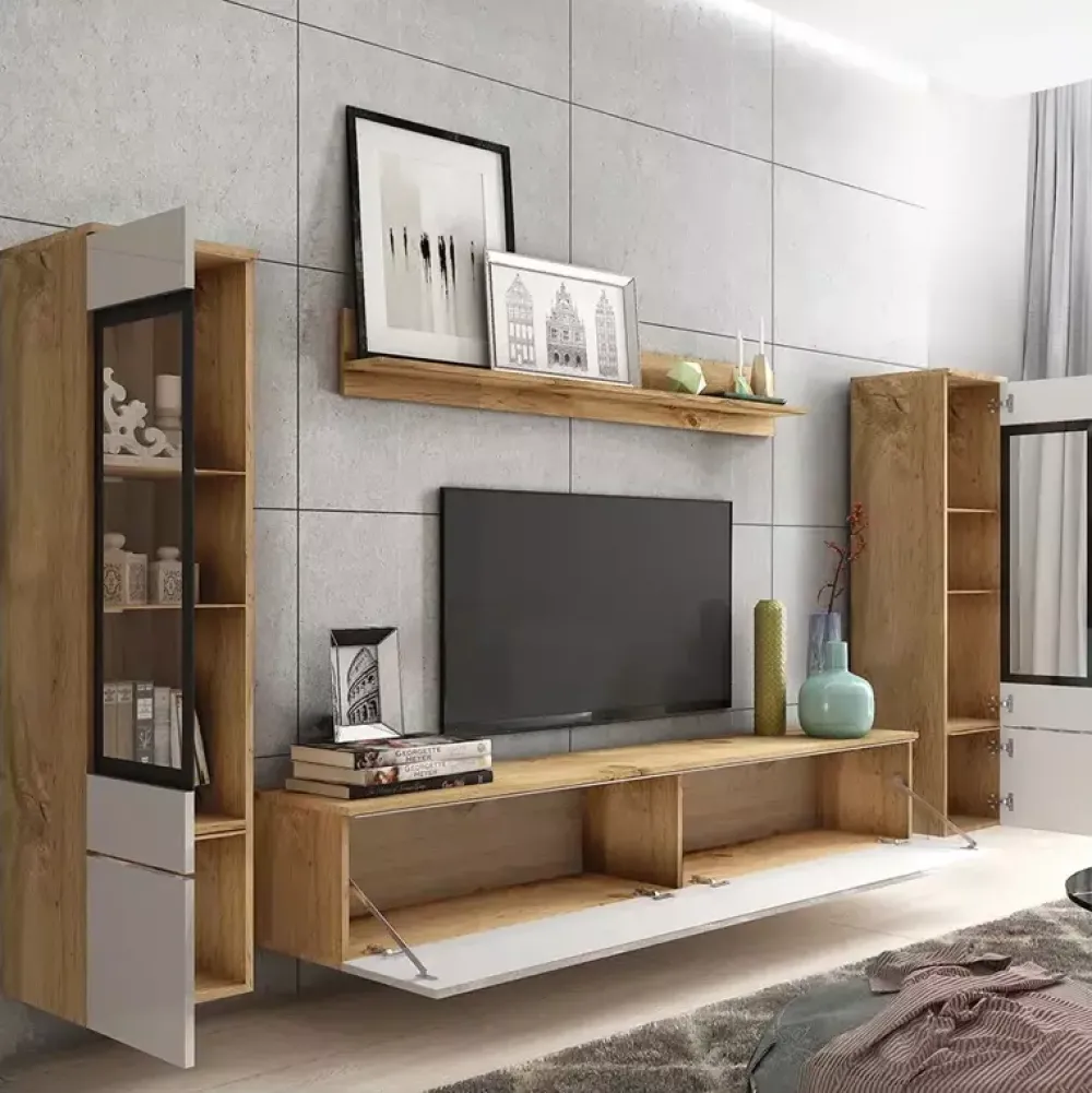 - Duża meblościanka VELLORE XL może być wisząca lub stojąca. To od ciebie zależy, jak ją wykorzystasz. Dwie witryny szklane, szafka rtv i półka wisząca mają korpus w kolorze dąb wotan i białe fronty w połysku.