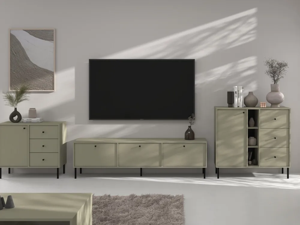 Nasza trzydrzwiowa szafka RTV to esencja nowoczesności i funkcjonalności. Zaprojektowana z myślą o nowoczesnych wnętrzach, oferuje wystarczająco dużo miejsca na przechowywanie sprzętu RTV, kabli i innych akcesoriów. Dzięki swojej konstrukcji doskonale współgra z pozostałymi elementami meblościanki.