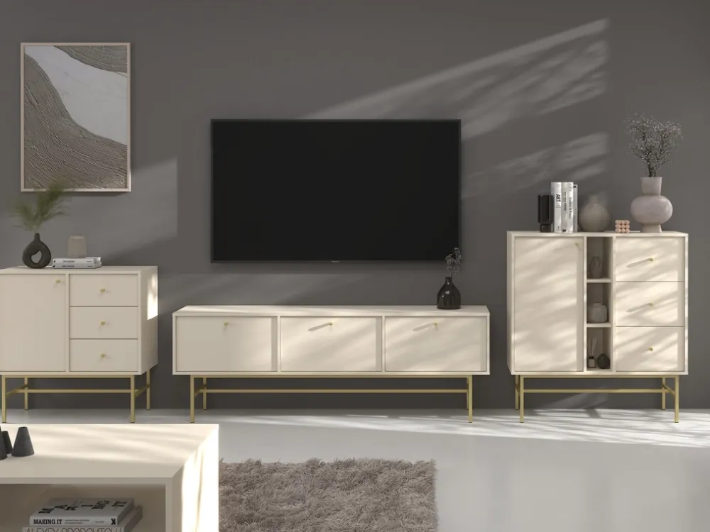 Nasza trzydrzwiowa szafka RTV to esencja nowoczesności i funkcjonalności. Zaprojektowana z myślą o nowoczesnych wnętrzach, oferuje wystarczająco dużo miejsca na przechowywanie sprzętu RTV, kabli i innych akcesoriów. Dzięki swojej konstrukcji doskonale współgra z pozostałymi elementami meblościanki.