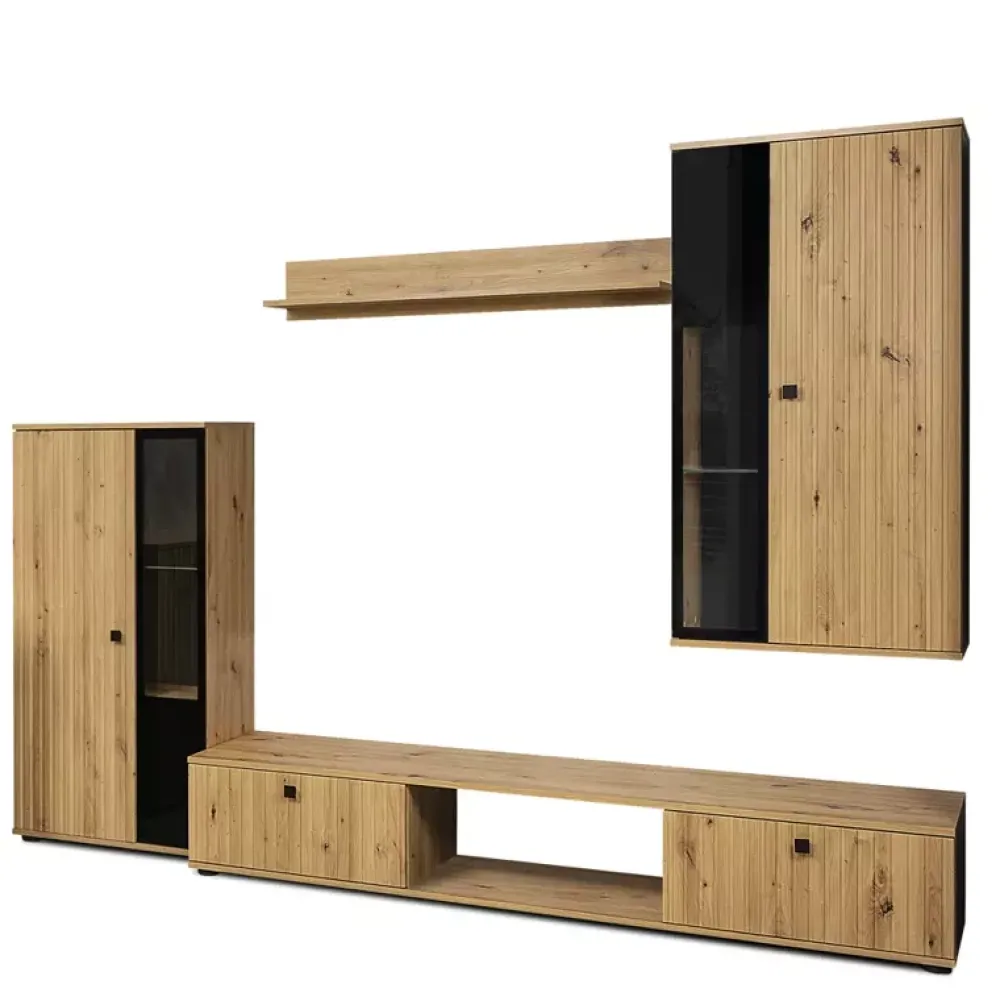 Wisząca witryna to kolejny element meblościanki, który zapewnia wiele miejsca na przechowywanie cennych przedmiotów lub innych ozdób. Szafka RTV jest idealna do przechowywania sprzętu multimedialnego i akcesoriów, a półka na książki to miejsce na ulubioną literaturę, albumy ze zdjęciami lub inne książki i czasopisma. Meblościanka z frezowanymi frontami to nie tylko funkcjonalne meble, ale także stylowy dodatek do Twojego salonu. Jeśli szukasz mebli, które wpiszą się w nowoczesny design, a jednocześnie są praktyczne i solidne, ta meblościanka z pewnością spełni Twoje oczekiwania.