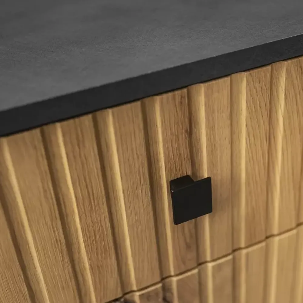- Meblościanka do salonu KUBA składa się z brył, których fronty wykonano z płyty MDF z widocznymi frezami. Bryły znajdujące się w meblościance posiadają uchwyty wykonane z metalu w czarnym kolorze, które dodają jej dodatkowych, eleganckich akcentów.
