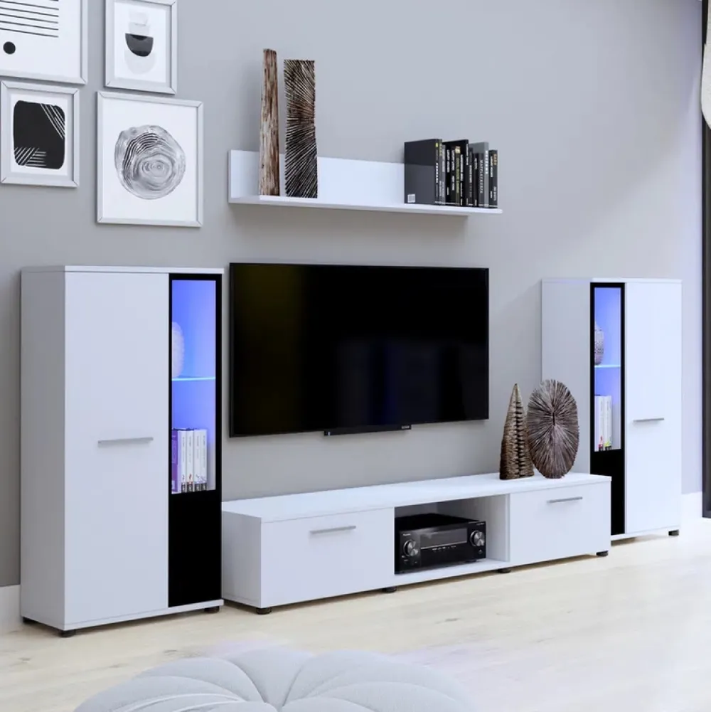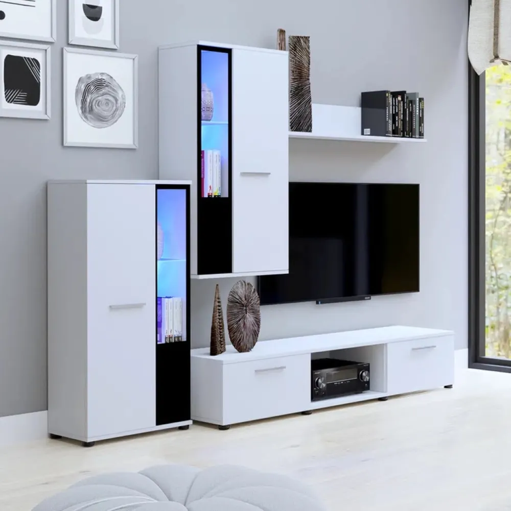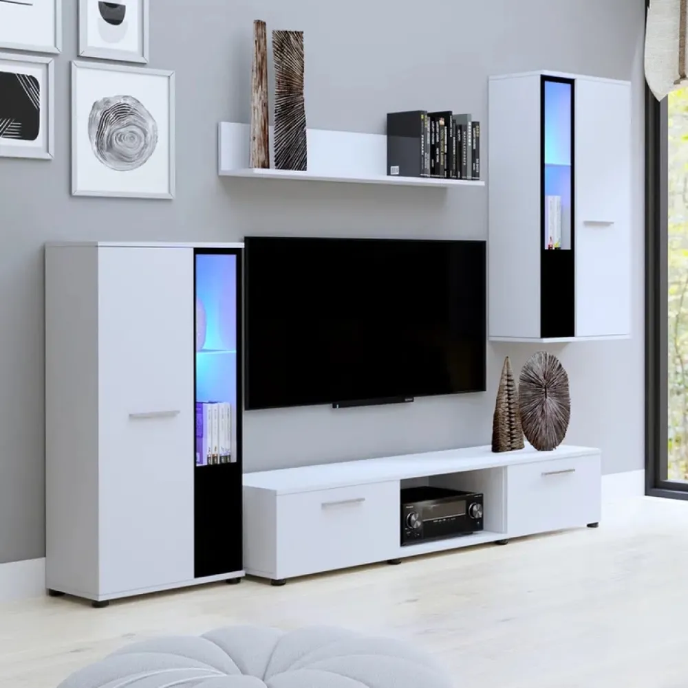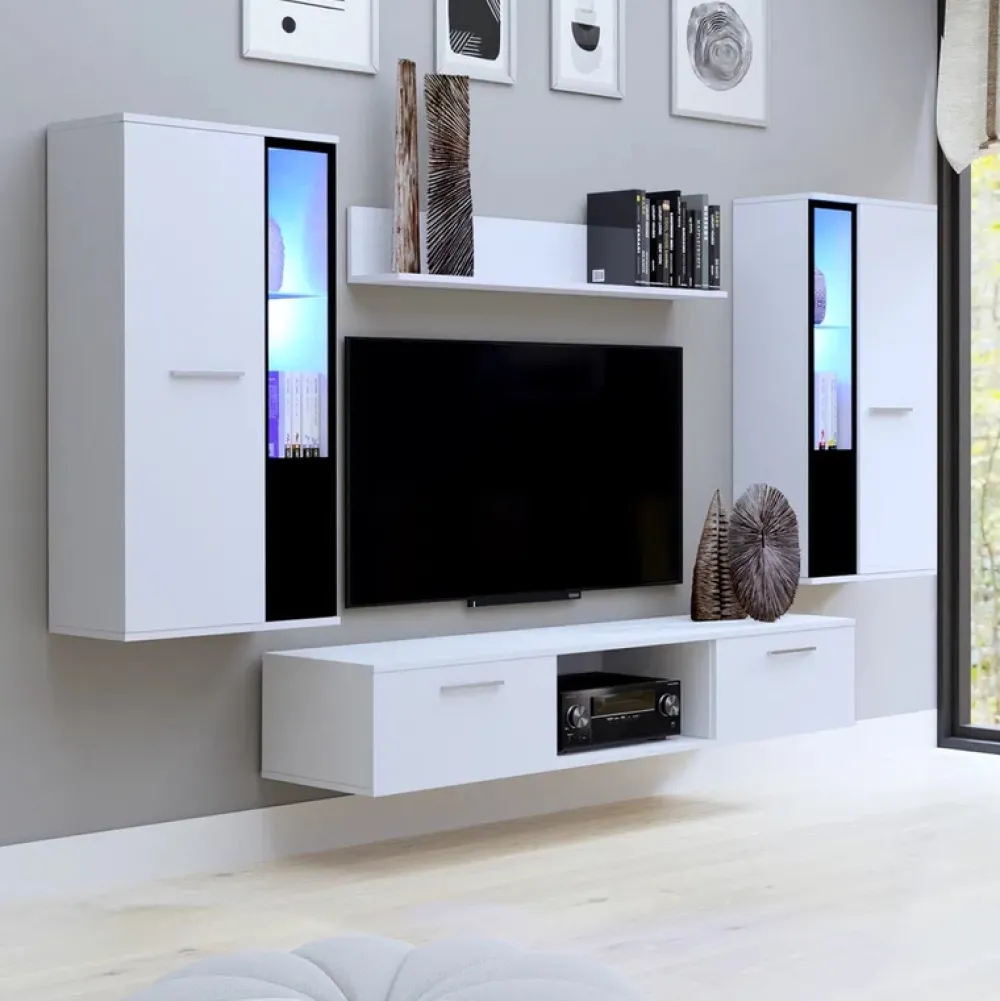 Odkryj nowoczesną elegancję i bezkompromisową funkcjonalność z naszą meblościanką z kolekcji CUBE, starannie wykonaną z wytrzymałej płyty o grubości 16 mm. Ten wyjątkowy mebel przemawia do tych, którzy cenią sobie nowoczesny design, oferując idealne połączenie stylu i praktyczności. W skład meblościanki wchodzą 4 elementy (półka, szafka RTV i dwie witryny). Meble można powiesić na ścianie bądź osadzić na dołączonych czarnych stopkach meblowych.