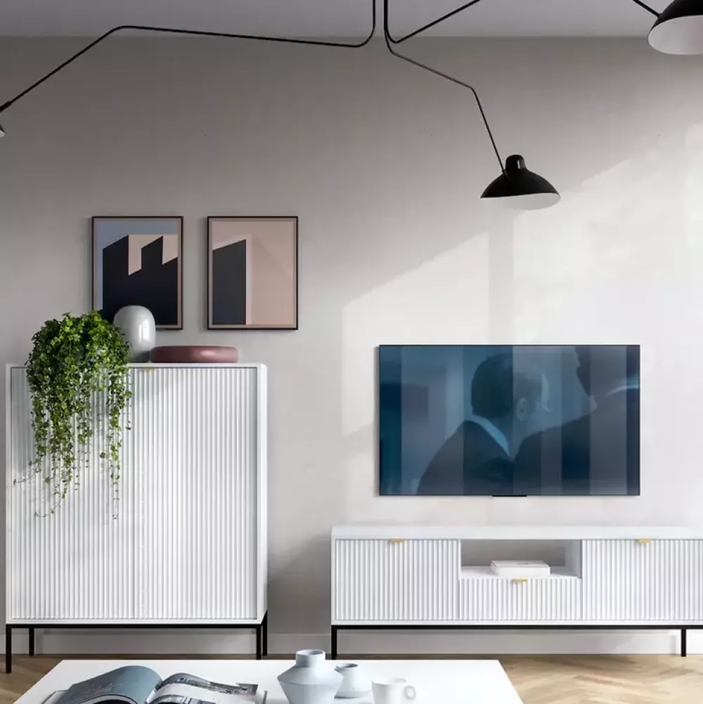Meblościanka AVANTI jest propozycją wykonaną w nowoczesnej stylistyce, dzięki której jest niezwykle uniwersalna aranżacyjnie. Meblościanka sprawdzi się zarówno we współczesnych aranżacjach, jak i glamour. W skład meblościanki wchodzi pojemna komoda z licznymi półkami wewnątrz, na których możesz umieścić swoje rzeczy czy akcesoria. Natomiast szafka RTV posiada drzwi po lewej oraz prawej stronie, oraz szufladę w swojej centralnej części.