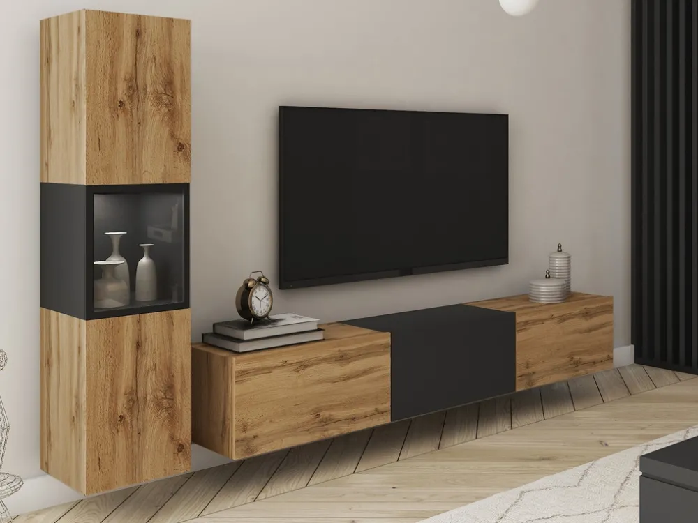 Zamów meblościankę BRAVIN w kolorze dąb wotan z czarną wstawką i stwórz wnętrze pełne stylu i funkcjonalności!