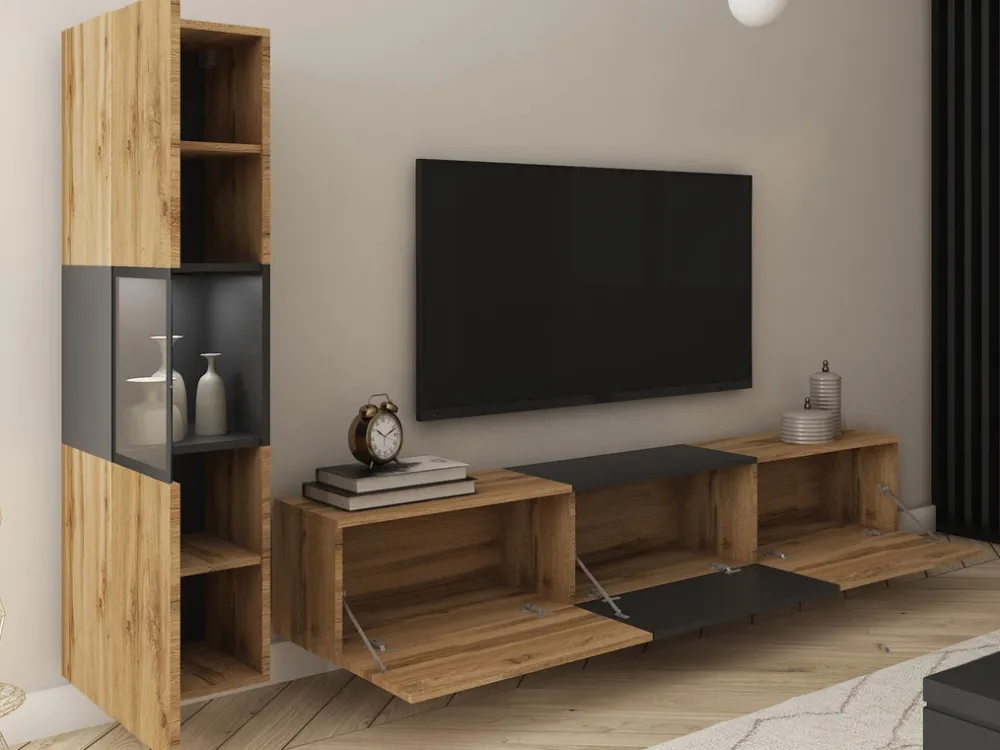- Montaż wiszący lub stojący – dopasuj układ mebla do układu salonu