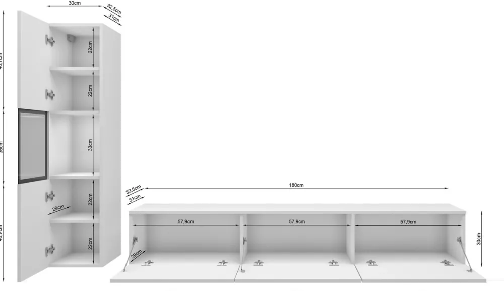- 1x szafka RTV: szer. 180 cm, wys. 30 cm, głęb. 32,5 cm