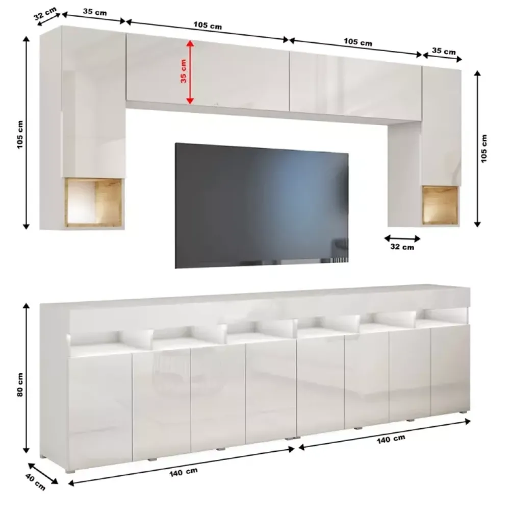 - Oświetlenie LED – Komoda oraz szafka posiadają możliwość doposażenia w dedykowane oświetlenie LED, które znajduje się w zakładce „Kup razem” pod galerią zdjęć. Aby wyposażyć meble w dedykowane oświetlenie LED, prosimy dodać do koszyka zestaw dwóch, oraz 2x zestaw trzech lampek podszafkowych.