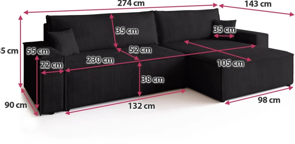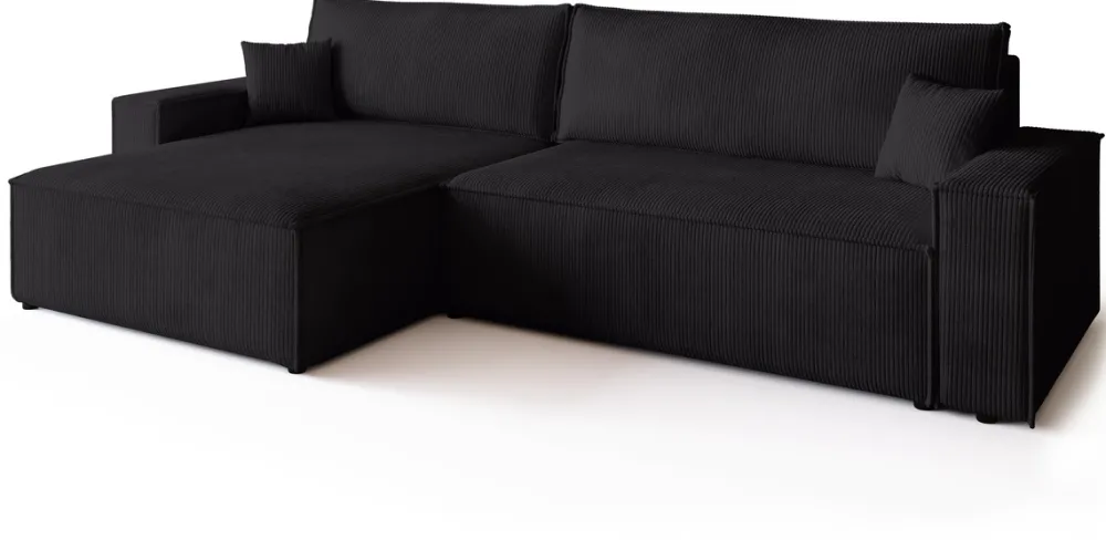 Ten narożnik to doskonałe połączenie komfortu, praktyczności i nowoczesnego designu. Obszyty modną sztruksową tkaniną, wprowadza do wnętrza ciepło i przytulność, a jego funkcjonalność sprawia, że idealnie sprawdzi się zarówno na co dzień, jak i podczas wizyt gości. Duża powierzchnia spania, wygodne siedzisko i pojemnik na pościel to wszystko, czego potrzebujesz, by stworzyć komfortową przestrzeń relaksu.