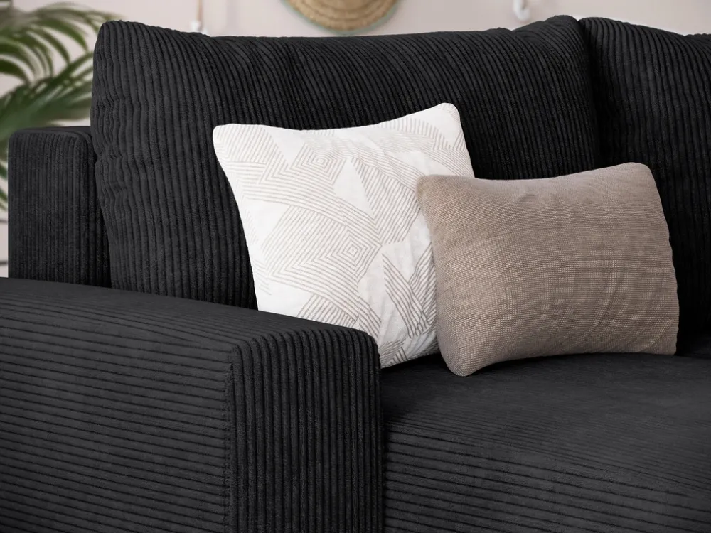 - Narożnik posiada tapicerowane plecy w tej samej tkaninie co reszta mebla, oznacza to, że można ustawić mebel nawet pośrodku salonu.