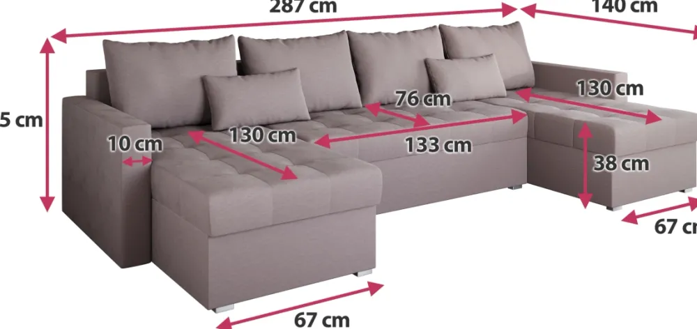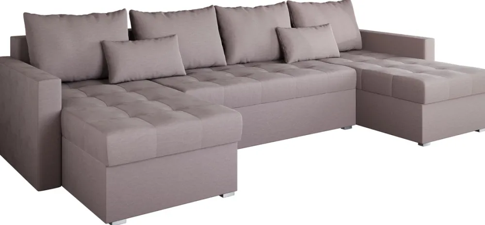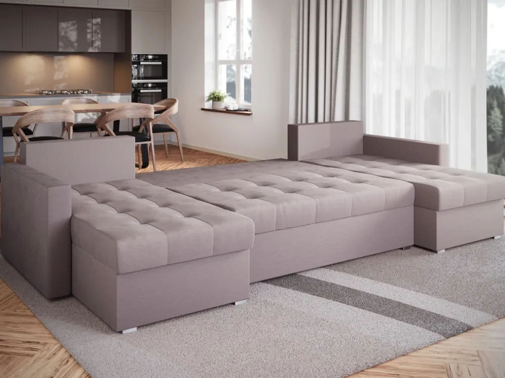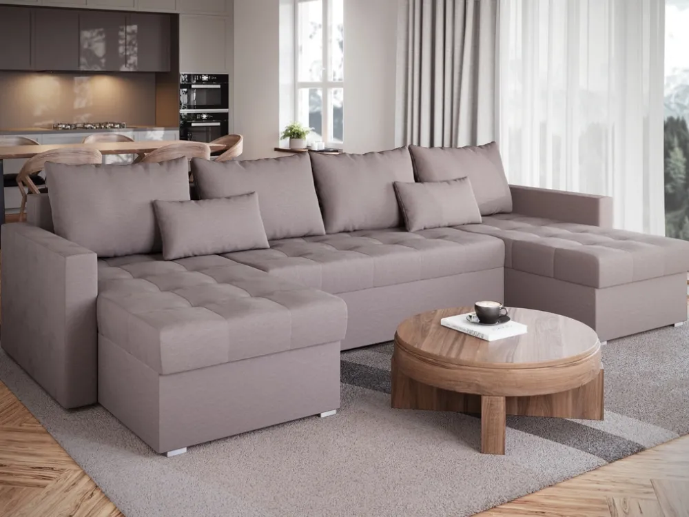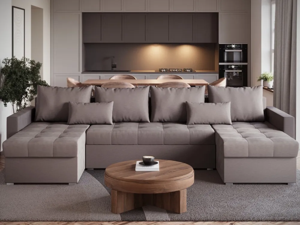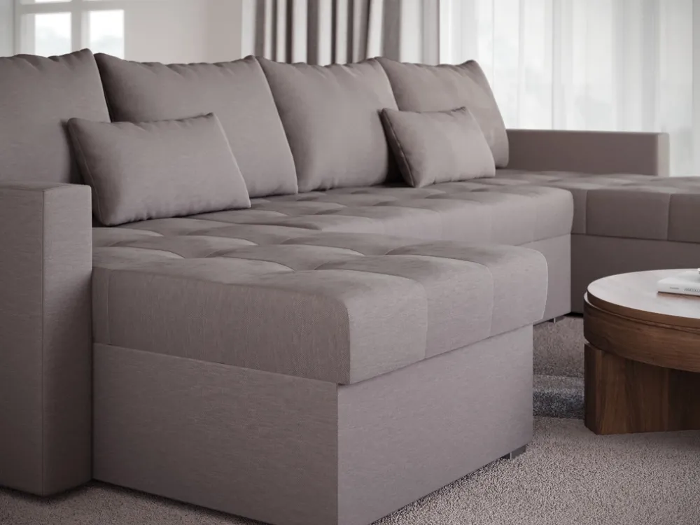Zaprezentuj swojemu salonowi nowy wymiar funkcjonalności dzięki nowoczesnemu narożnikowi U-kształtnemu HOT. Idealnie wpasuje się w przestrzeń większych salonów, zapewniając komfortowe miejsce do odpoczynku dla całej rodziny. Dzięki funkcji spania o wymiarach 120×267 cm, narożnik ten łatwo przekształci się w wygodne łóżko, idealne do codziennego użytku lub jako dodatkowe miejsce do spania dla gości.