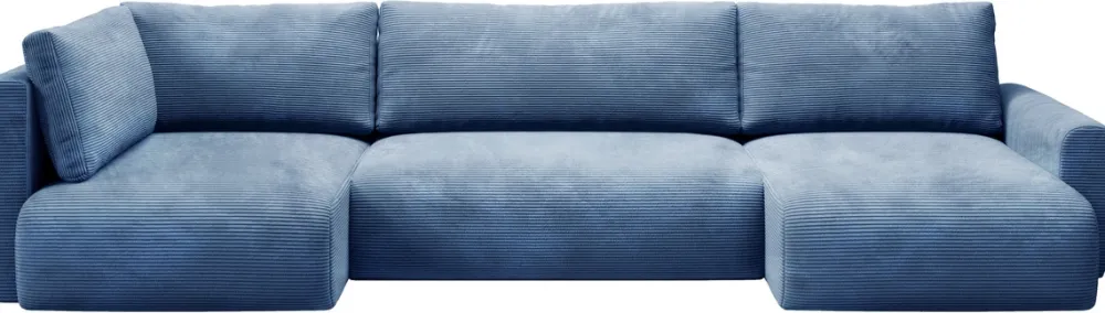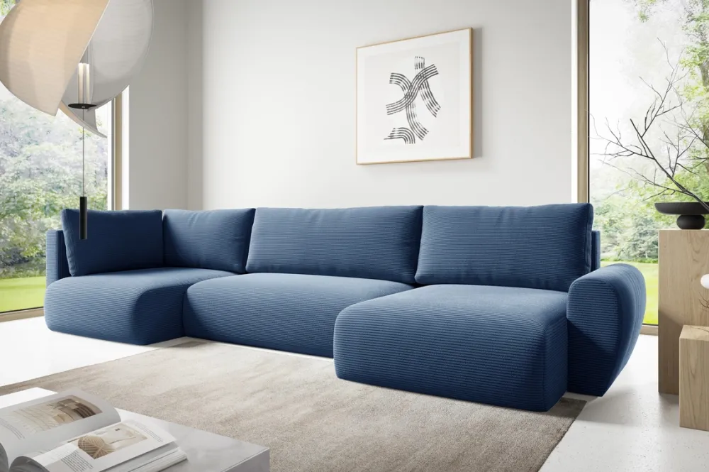 Sztruksowy narożnik U PATI MAXI to idealne rozwiązanie dla osób ceniących sobie zarówno komfort, jak i nowoczesny design. Kształt U narożnika sprzyja wspólnym chwilą z bliskimi, umożliwiając użytkownikom swobodne konwersacje i wspólne spędzanie czasu, dzięki dużej ilości miejsca do siedzenia. Obłe kształty oraz zaokrąglone boczki dodają meblowi lekkości i nowoczesnego wyglądu, a jednocześnie sprawiają, że jest on bardziej przyjazny dla domowników, w tym dzieci.