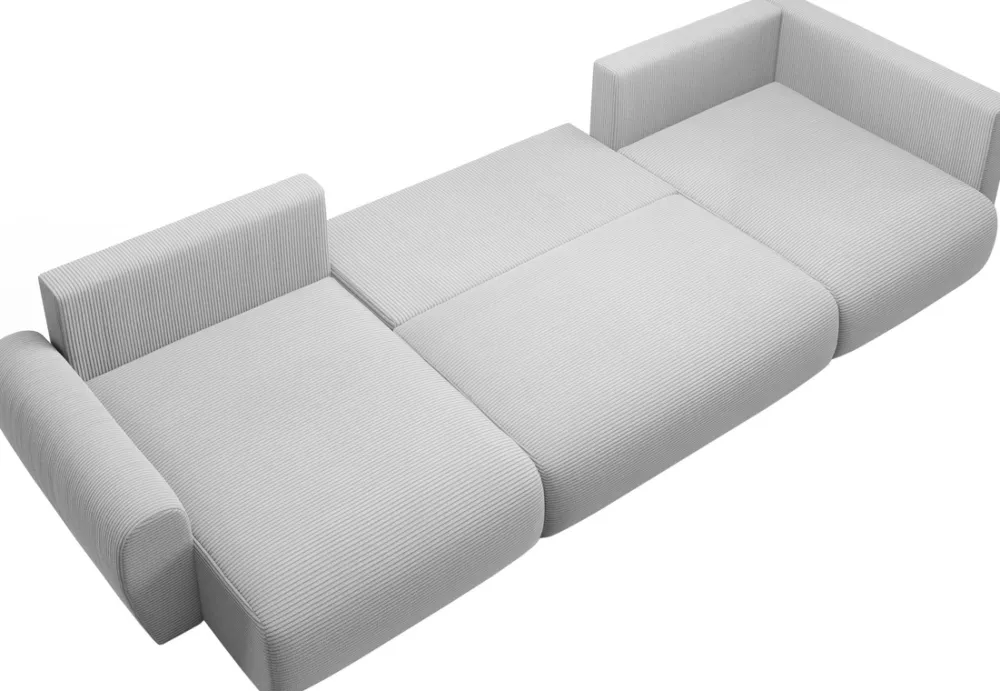 Duży narożnik U do salonu wyposażony jest w funkcję spania o powierzchni 344×133 cm, co czyni go nie tylko miejscem do siedzenia, ale również wygodnym łóżkiem dla gości. W siedzisku zastosowano kombinację sprężyny falistej i pianki PUR, która zapewnia odpowiedni komfort oraz wsparcie. Automat DL ułatwia rozkładanie mebla, pozwalając na łatwe i szybkie rozłożenie narożnika.