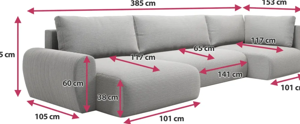 Mebel oferuje także praktyczne rozwiązania takie jak pojemnik na pościel, będący dużym udogodnieniem w codziennym użytkowaniu, pozwalając schować wszystkie potrzebne do snu akcesoria, oszczędzając tym samym miejsce w szafach czy komodach. Cztery duże, profilowane poduszki zapewniają dodatkowe wsparcie i wygodę. Duży narożnik U PATI MAXI jest obity miłą w dotyku sztruksową tkaniną Poso, co dodatkowo podnosi jego estetykę oraz gwarantuje łatwość w utrzymaniu czystości.