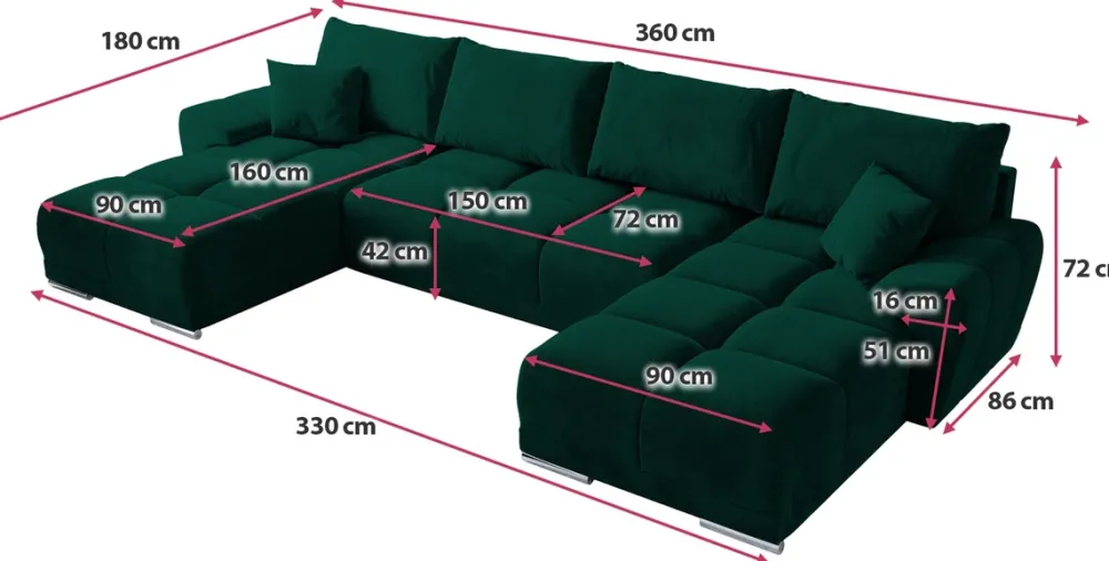 Przede wszystkim kształt litery U. Zagwarantuje to, że każdy znajdzie dla siebie komfortowe miejsce podczas długich rodzinnych wieczorów lub spotkań z przyjaciółmi.