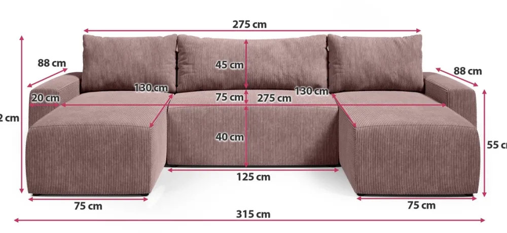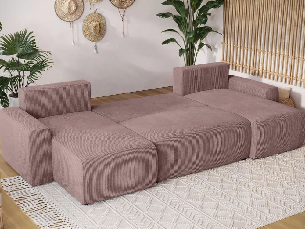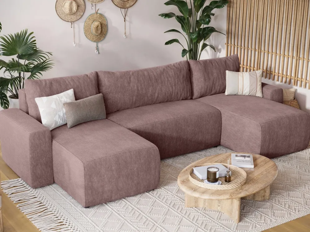 Narożnik w kształcie U z funkcją spania 125×275 cm PLUSH U to idealne rozwiązanie dla każdego, kto ceni sobie wygodę i praktyczność. Dzięki swojemu przemyślanemu designowi doskonale sprawdzi się zarówno w przestronnych salonach, jak i w mniejszych pomieszczeniach, oferując mnóstwo miejsca do siedzenia i spania.