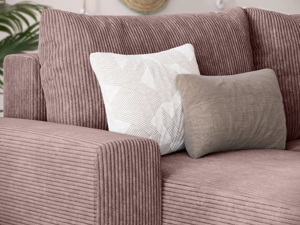 - Narożnik posiada tapicerowane plecy w tej samej tkaninie co reszta mebla, oznacza to, że można ustawić mebel nawet pośrodku salonu.