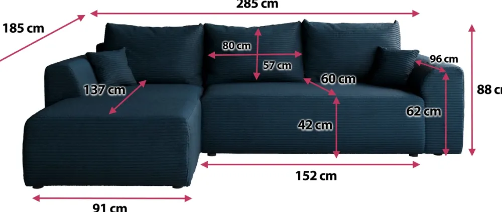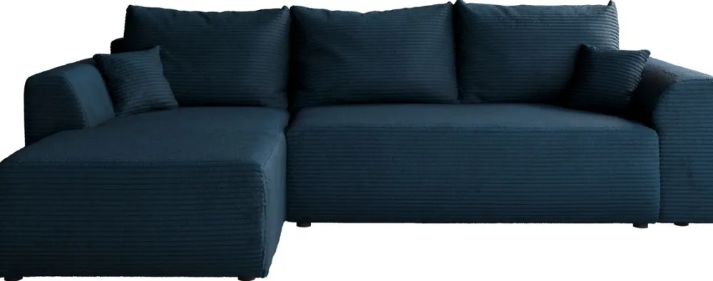 Siedzisko narożnika zostało wypełnione wysokiej jakości pianką PUR i sprężynami falistymi, co zapewnia odpowiednie podparcie ciała zarówno podczas siedzenia, jak i podczas snu. Trzy duże poduszki oparciowe oraz dwie mniejsze poduszki dekoracyjne zapewniają dodatkowy komfort i nadają narożnikowi przytulny wygląd.