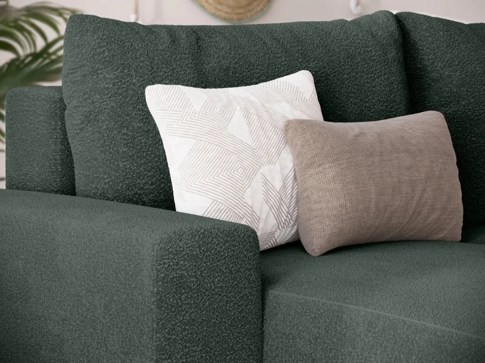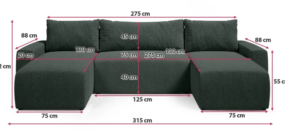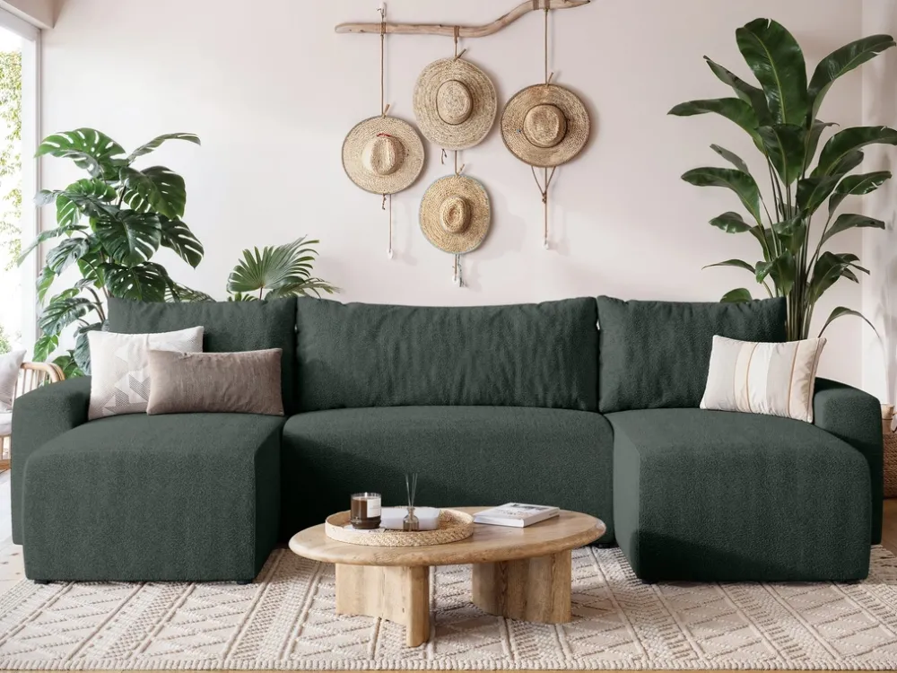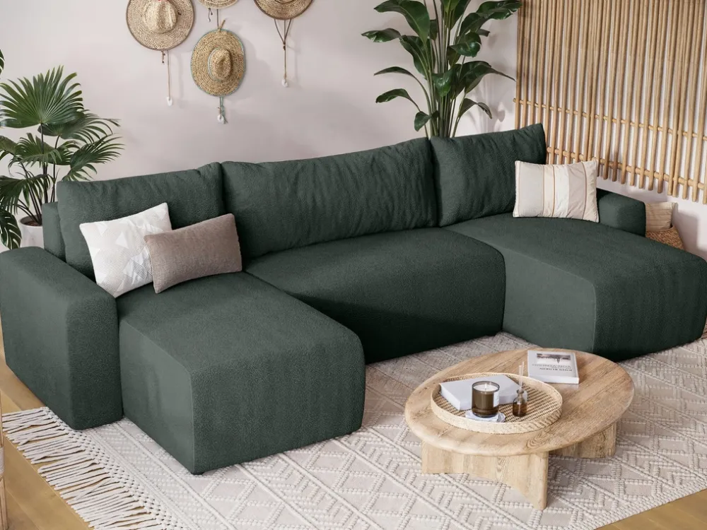 Narożnik w kształcie U z funkcją spania 125×275 cm PLUSH U to idealne rozwiązanie dla każdego, kto ceni sobie wygodę i praktyczność. Dzięki swojemu przemyślanemu designowi doskonale sprawdzi się zarówno w przestronnych salonach, jak i w mniejszych pomieszczeniach, oferując mnóstwo miejsca do siedzenia i spania.