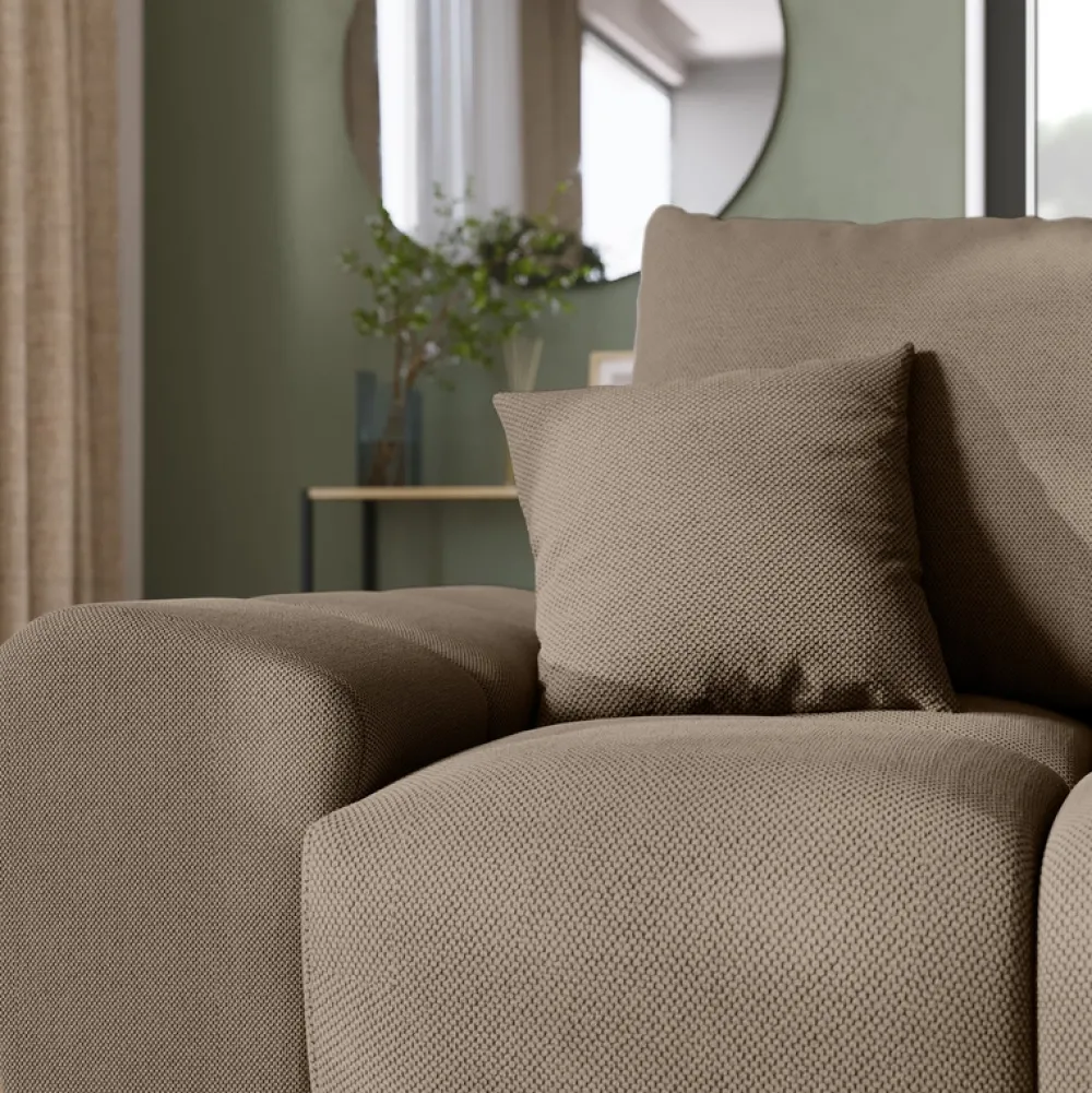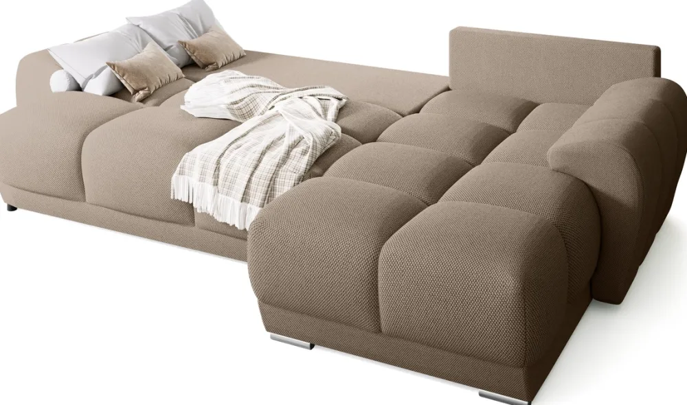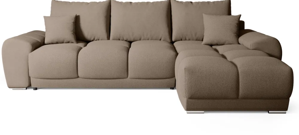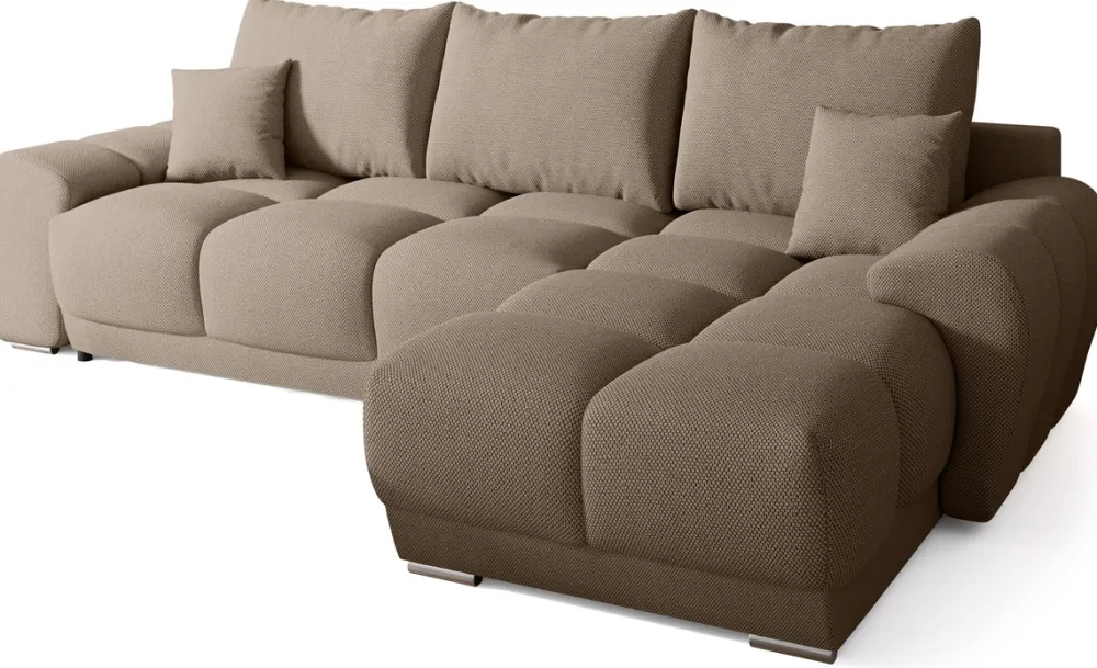 - Brązowy narożnik z funkcją spania o wymiarach 130×220 cm. Wyposażony w automat DL, który ułatwia rozłożenie funkcji spania, oraz dostęp do pojemnika na pościel. Rogówka dostępna w kilkunastu najpopularniejszych kolekcjach tkanin.