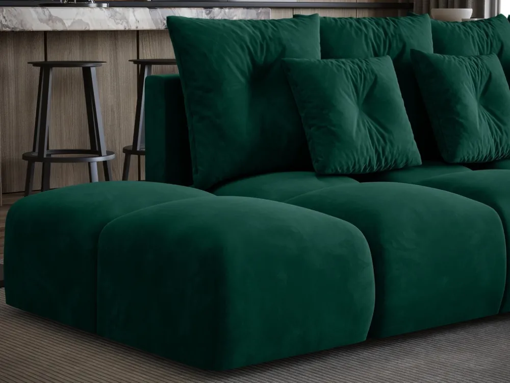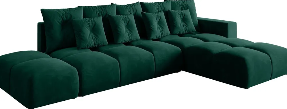 Dopełnieniem całości jest pięć dużych poduszek oparciowych oraz cztery małe poduszki, które podnoszą komfort siedzenia i pozwalają na relaks w dowolnej pozycji. Ich różnorodne rozmieszczenie umożliwia łatwe dopasowanie do preferencji użytkowników, czyniąc narożnik idealnym miejscem do codziennego wypoczynku.