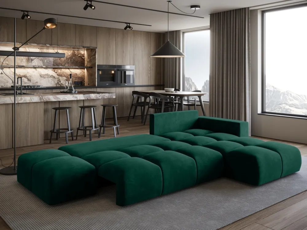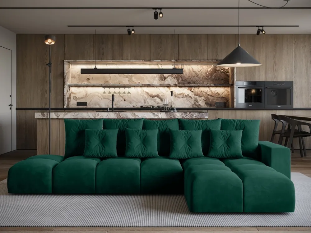 Dzięki mechanizmowi rozkładania DL narożnik z łatwością przekształca się w przestronne łóżko o wymiarach 130×245 cm, oferując wygodne miejsce do spania dla gości. Wbudowany pojemnik na pościel pod siedziskiem pozwala na szybkie i dyskretne przechowywanie kołder i poduszek, utrzymując porządek w salonie.