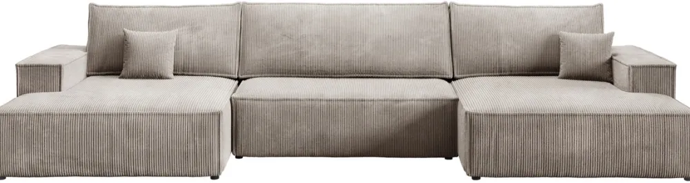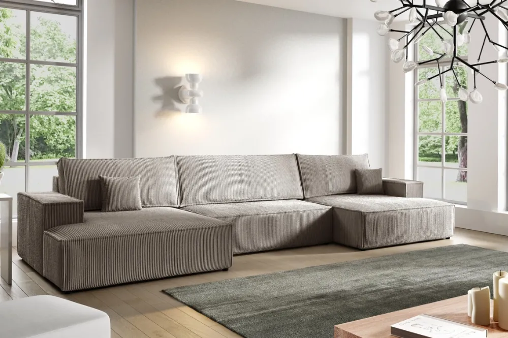 - Duży narożnik w kształcie U PABLO wyposażony został w funkcję spania, głęboki pojemnik na pościel, komplet miękkich poduch, a także automat DL, który ułatwia rozkładanie. Sztruksowy narożnik obity został miękką w dotyku sztruksową tkaniną Poso.