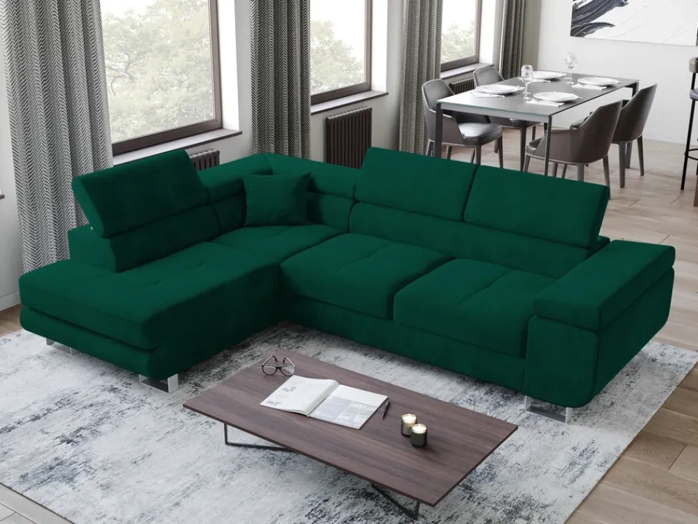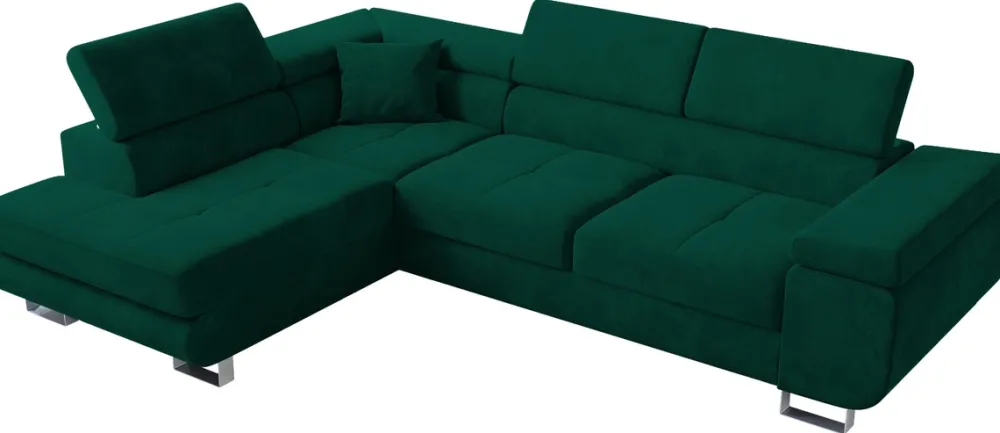 - Rozkładany narożnik do salonu ANTON cechuje się wysokimi metalowymi nóżkami, solidną konstrukcją oraz regulowanymi zagłówkami z pięciostopniową regulacją. Miękkie siedzisko na bazie sprężyn falistych wypełnione jest wysokoelastyczna pianką.