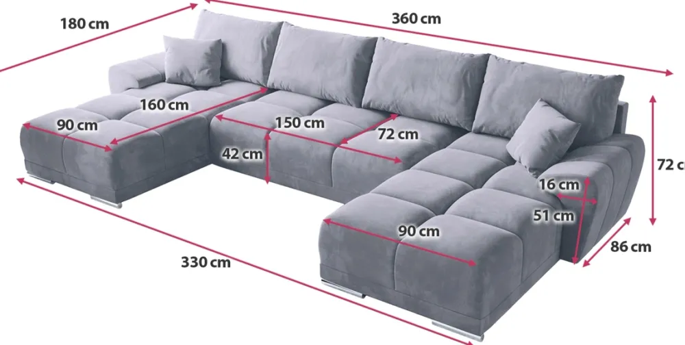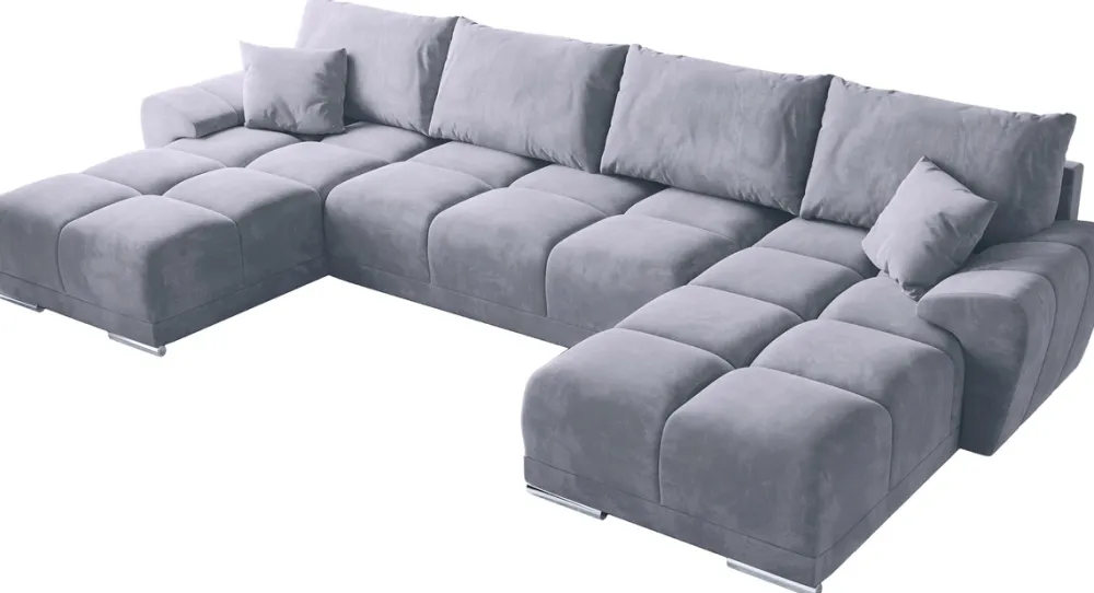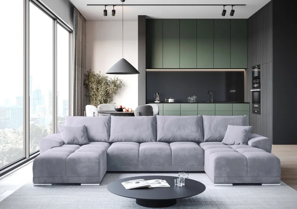 Ponadto rozkładany narożnik do salonu jest bardzo praktyczny. Posiada pojemnik na pościel pod siedziskiem, dzięki czemu możesz przechowywać dodatkowe koce i poduszki, zwalniając miejsce w szafach. Natomiast funkcja spania sprawia, że welurowy narożnik do salonu może służyć jako wygodne miejsce do snu dla gości, nawet pomimo braku dodatkowego pokoju gościnnego.
